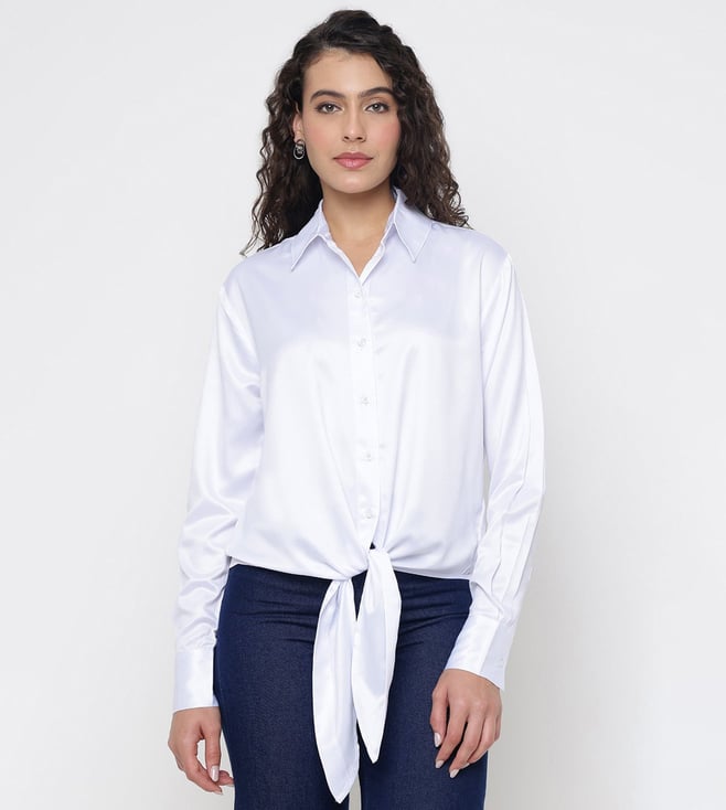 Anna Chic Look Soft Satin Pure White Solid Spread Collar Regular Fit Shirt