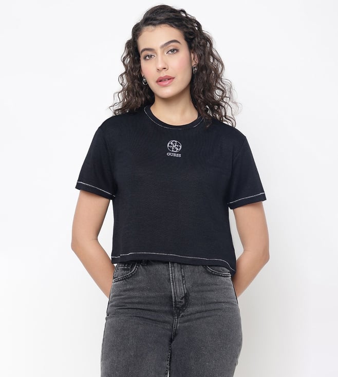 Black Pure Cotton Embellished Round Neck T-Shirt