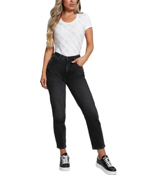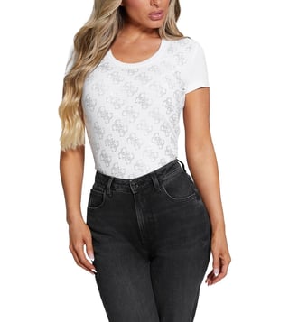 Guess Women's White Cotton Monogram Slim Fit T-Shirt