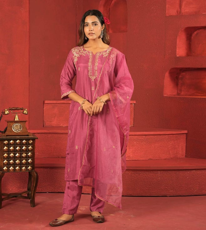 Pink Silk Regular Fit Hand Work Co-Ord Set