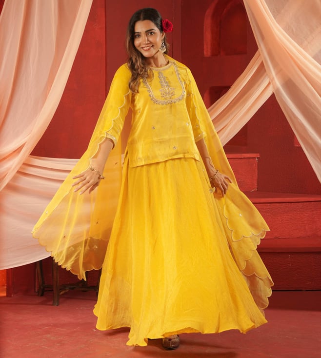 Yellow Tissue Regular Fit Kurta & Skirt Set With Dupatta