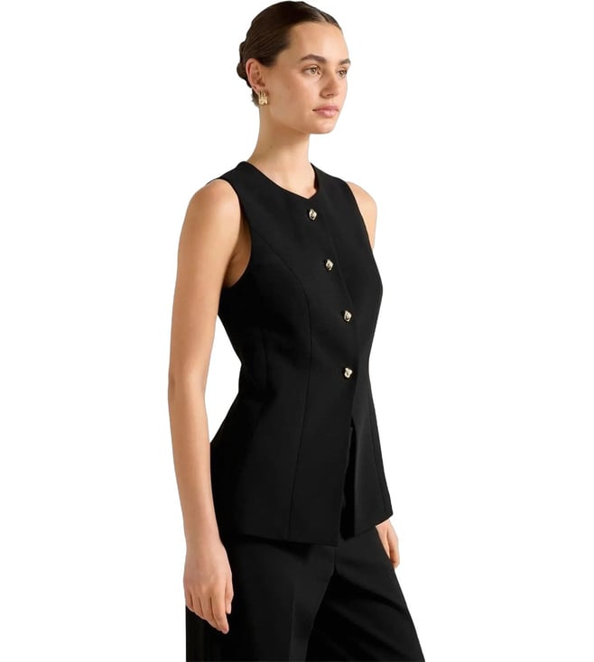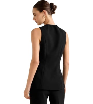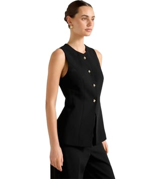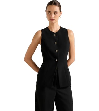 Elevate your look with the Forever New Kai Gathered Detail Blouse, a perfect blend of feminine glamour and trending details. This sharp and structured waistcoat is tailored for a modern, clean layering option, featuring a high neckline, sleeveless design, and gold-tone button detailing. Made from a smooth woven blend fabrication, this waistcoat is lined for added sophistication. With a tailored fit and vertical seams, this versatile piece is a must-have for any wardrobe. Perfect for every occasion, this update will keep you stylish season after season.