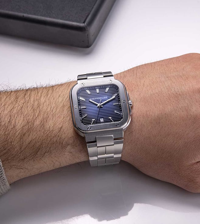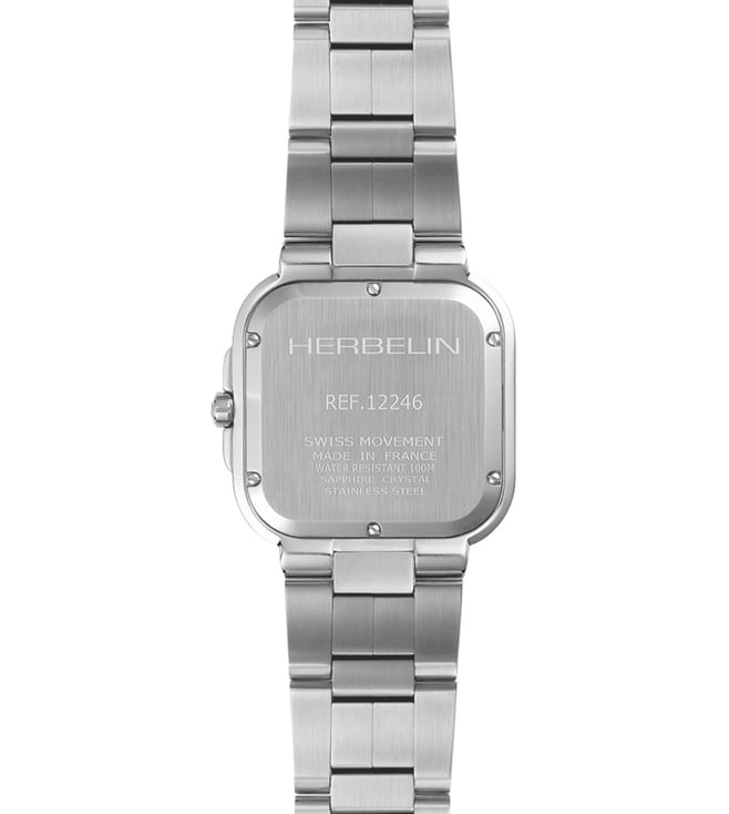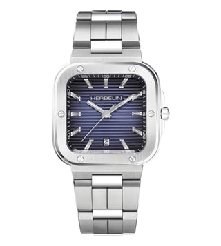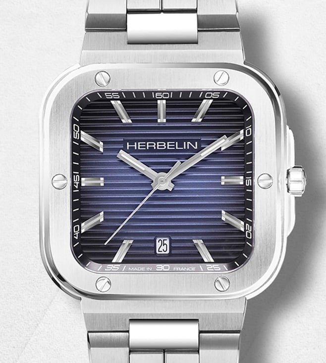 The Cap Camarat collection is growing with this new shape of case. Made of stainless steel, the case is square with rounded corners. Original and modern, this watch will dress with elegance the male wrists. The case is in line with the integrated bracelet and gives this watch a modern and sporty spirit. The blue gradient background and the horizontal strike bring a touch of elegance to Cap Camarat. Herbelin signs all his models in Charquemont. Cap Camarat is the worthy heir of the 70s Michel Herbelin collection. Its sporty and elegant look is enhanced by a sculpted design