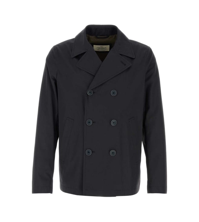 Upgrade your outerwear collection with the Herno Navy Blue trench coat. Crafted with high-quality materials, this trench coat features double-breasted, long sleeves, front button fastening, two side welt pockets, internal pocket, partial lining. for unmatched warmth and style. The sleek design offers a flattering silhouette, while the versatile color and fabric ensure it complements any outfit. Perfect for both casual outings and formal events.