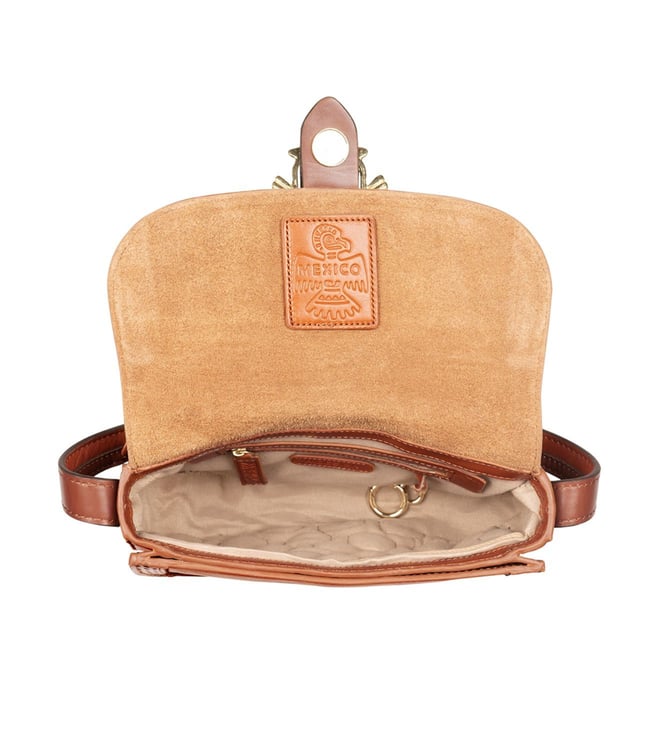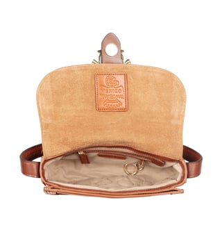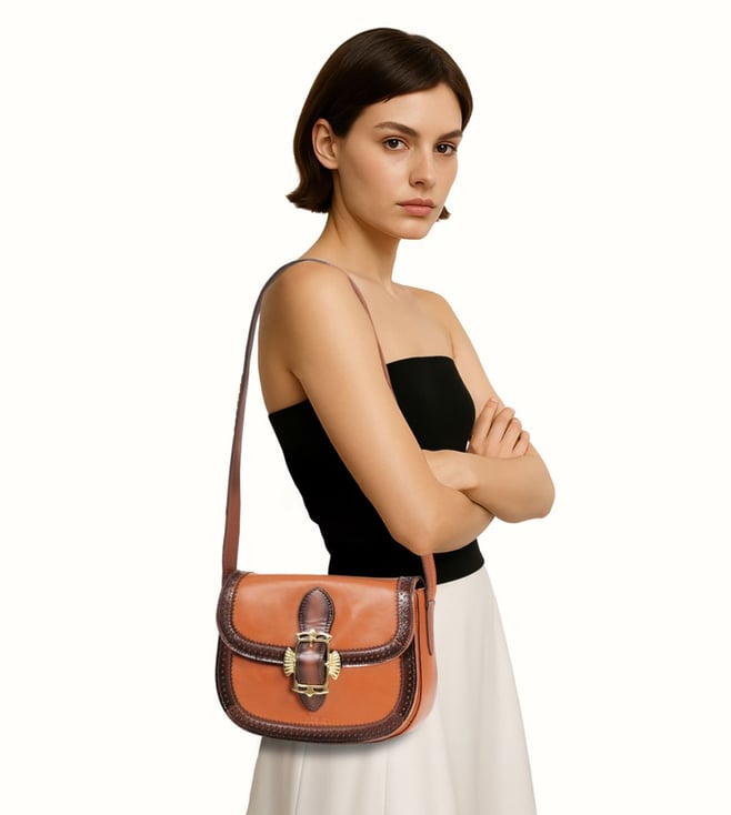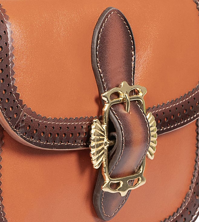 Crafted details, timeless charm. The Churro 02 shoulder bag brings everyday style with artisanal detail. Handcrafted in Americano high-shine leather with Melbourne Ranch trim,it features a brogue-inspired design with spray-tipped edges and contrast weaving that highlight its craftsmanship. A secure flap closure with a magnet is finished with a sand-cast brass buckle that feels like jewellery. Compact yet smartly built with organised pockets,its a bag that pairs elegance with daily ease.
