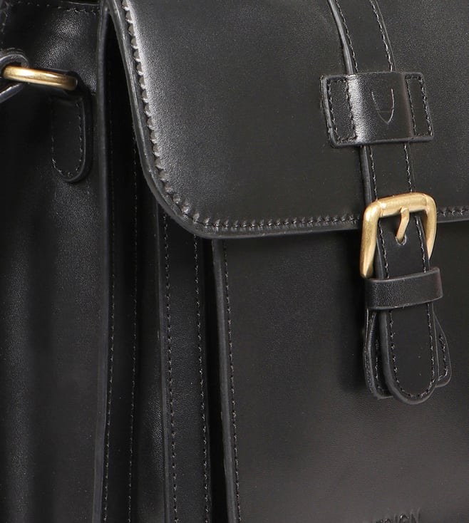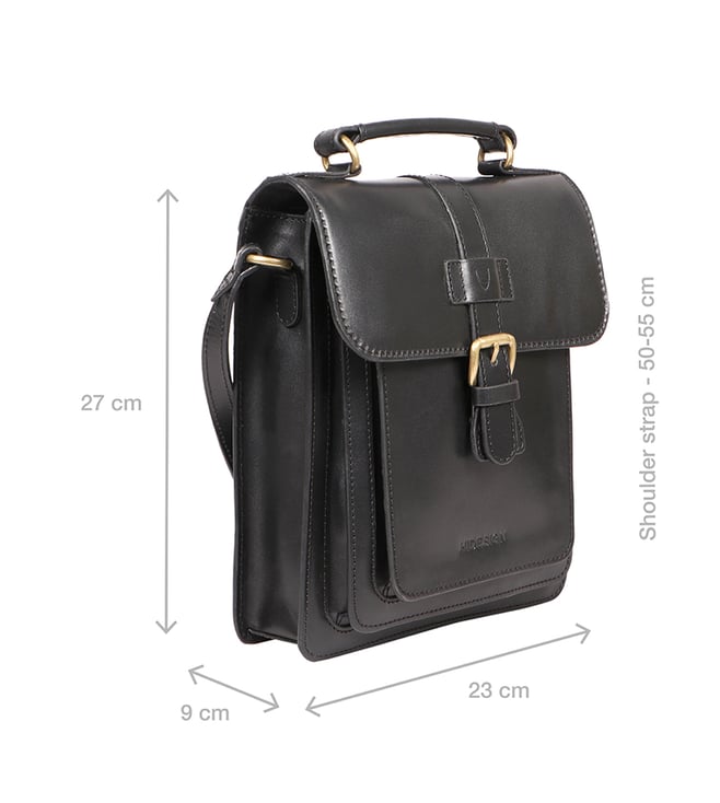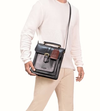 The Hidesign Sustain - 04 Mens Crossbody Bag in black is perfect for casual occasions. Made from leather, it offers style and durability for men. Comes with a single adjustable strap. By Hidesign.' Disclaimer: All other items in the image are only for display purposes and will not be a part of the delivery content. Product colour may slightly vary due to photographic lighting sources. Country of Origin - India.