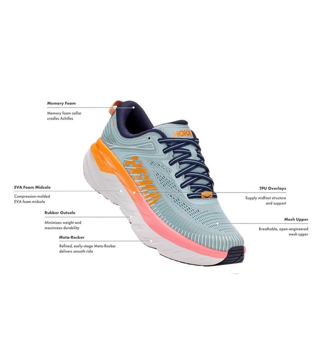 The most cushioned shoe in the HOKA road-shoe lineup, the game-changing Bondi 7 delivers a smooth, balanced ride over any distance. The open-engineered mesh construction delivers breathable comfort. Memory foam collar cradles ankle in plush comfort. TPU overlays offer additional midfoot structure and support. The internal heel counter provides a supportive, locked-in fit. It has a full-length compression-molded EVA midsole. It has refined early-stage Meta-Rocker for a smooth ride. Beveled heel design offers a smooth transition. It has a heel height of 33mm and a weight of 303g.
