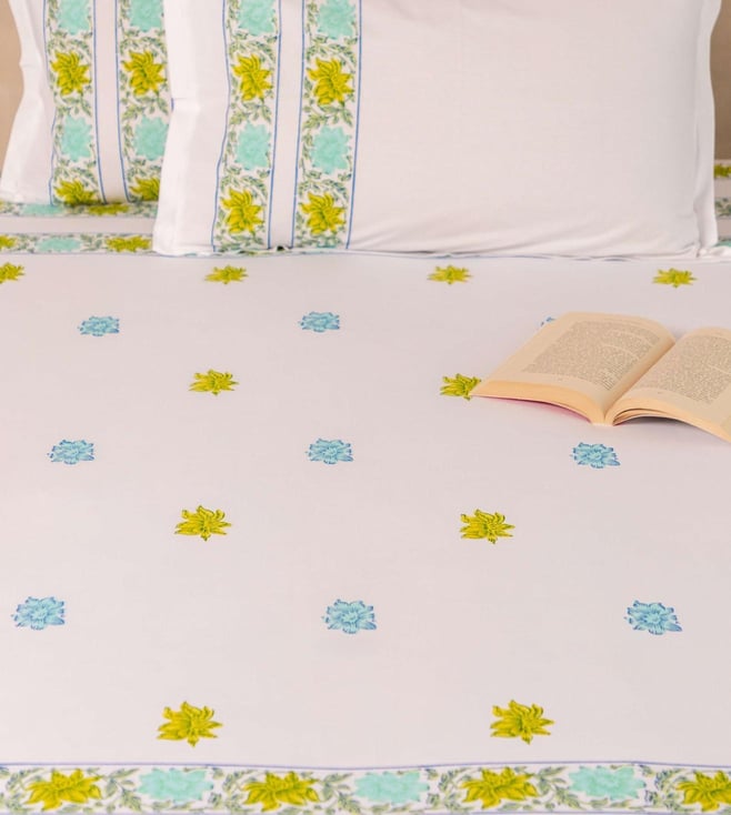 Jaipur White Spring Streer Petunia Hand Block Printed 1 Bedsheet with 2 Pillow Case