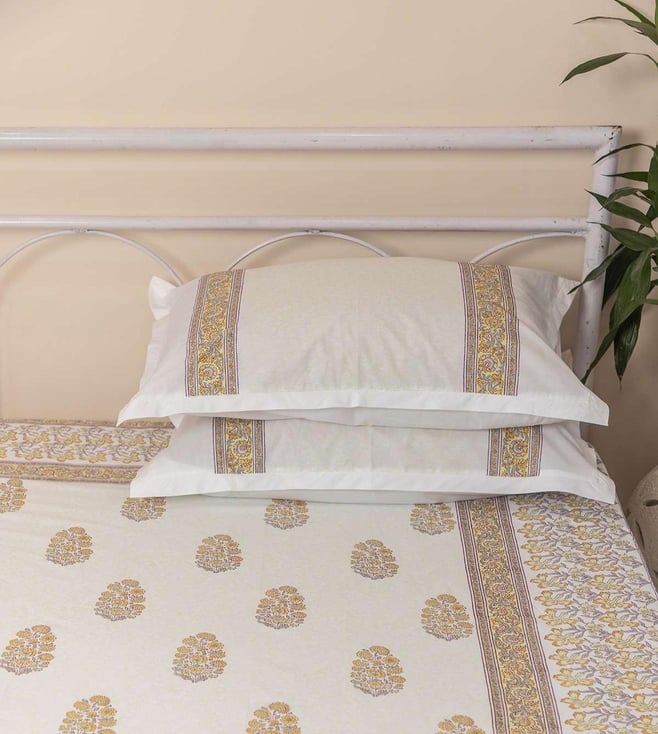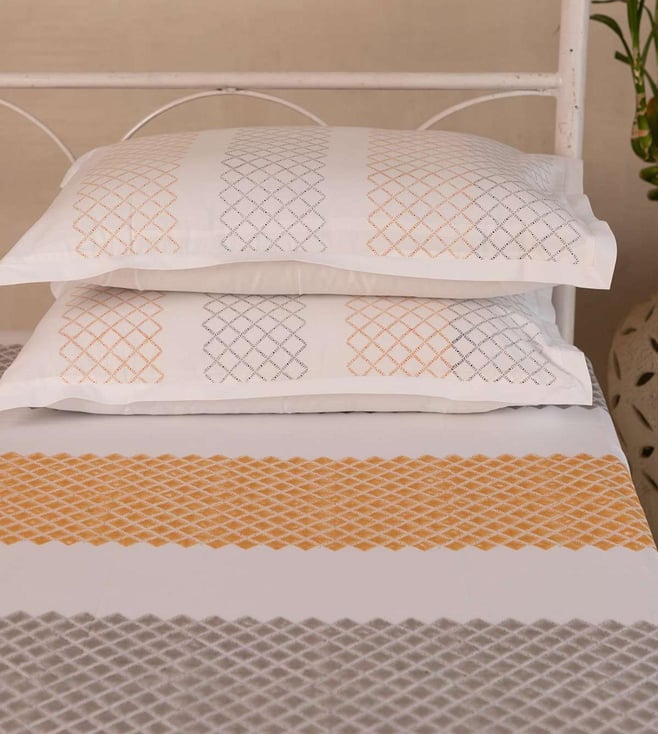 Jaipur Mustard & Grey Honeycomb Hand Block Printed 1 Bedsheet with 2 Pillow Case