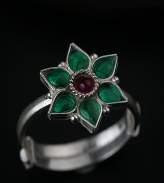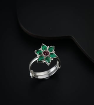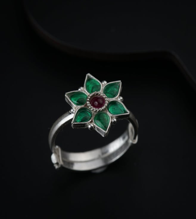 Silver green nakshatra flower ring, handmade ring made in 92.5 silver with green cz stones. Crafted from 92.5 percent sterling silver, this piece reflects artisanal skill and timeless charm. Ideal for special occasions or everyday elegance. Style tip, pair it with ethnic or fusion wear for a standout look.