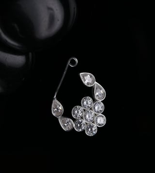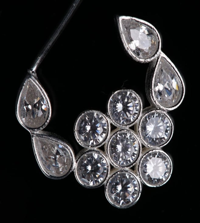 Silver CZ nath floral (left, clip on), handmade nath floral left clip on made in 92.5 silver with CZ stones. Crafted from 92.5 percent sterling silver, this piece reflects artisanal skill and timeless charm. Ideal for special occasions or everyday elegance. Style tip, pair it with ethnic or fusion wear for a standout look.