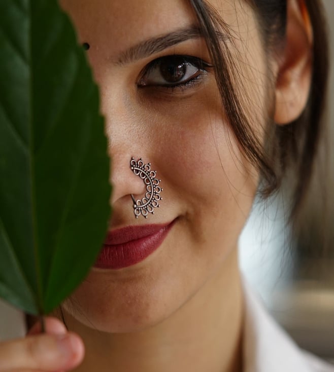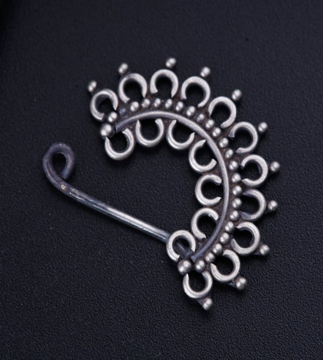 Enhance your traditional appearance with the exquisite silver filigree nath (left, clip on) handcrafted in 92.5 sterling silver. This elegant nose ring is a masterpiece of intricate filigree work, showcasing the beauty of timeless artisanship. Perfect for cultural events and weddings, the silver filigree nath at House of Aadyaa adds sophistication to your look. Each piece is handmade and embodies the rich heritage of made in india craftsmanship.