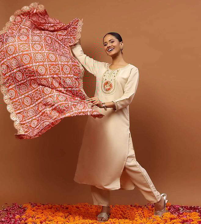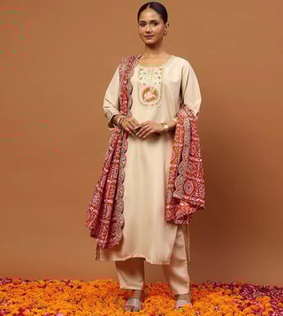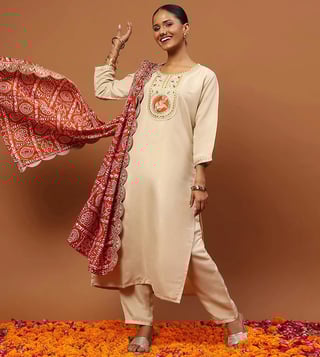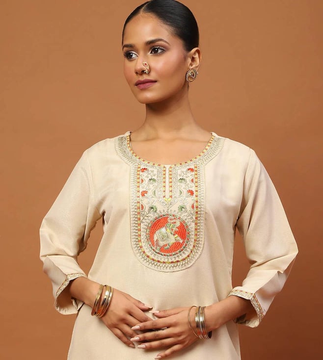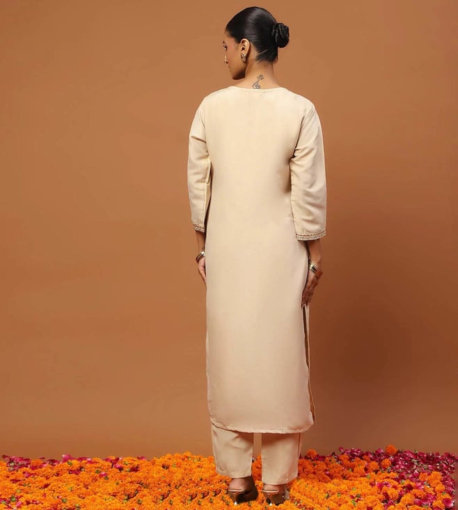 Discover the Crafted from luxurious satin, House Of Chikankari Beige Cotton Blend Regular Fit Kurta Set this dress offers elegance and versatility in vibrant hues. Disclaimer: All other items in the image are only for display purposes and will not be a part of the delivery content. Product colour may slightly vary due to photographic lighting sources. Country of Origin - India.