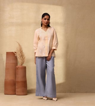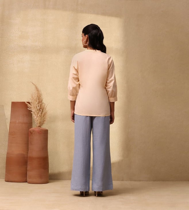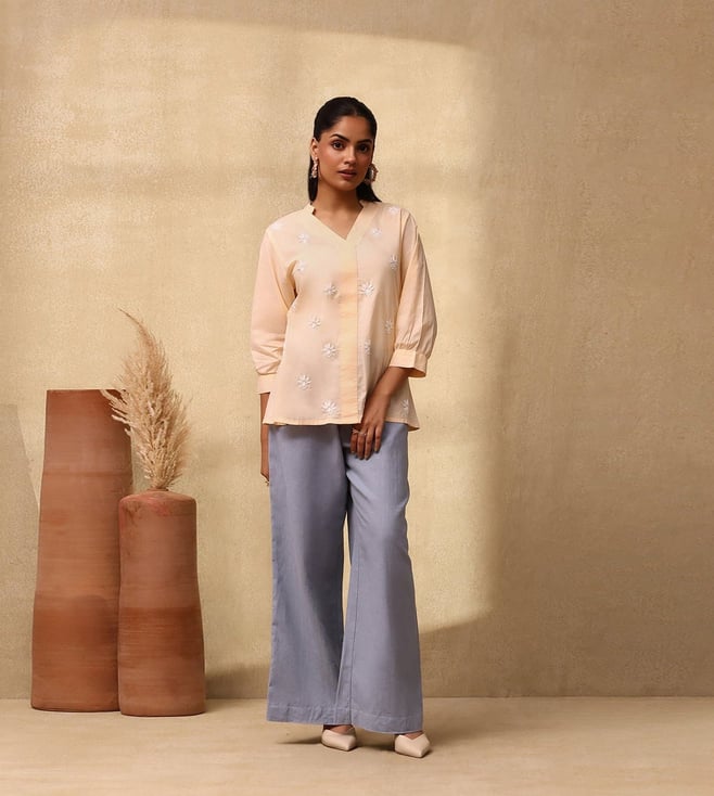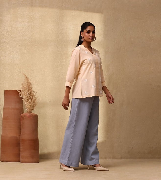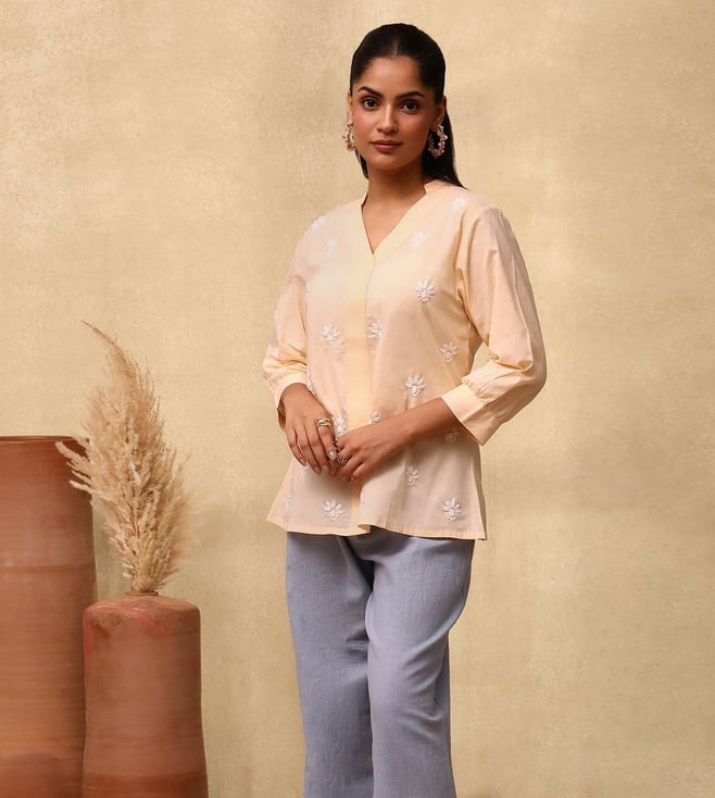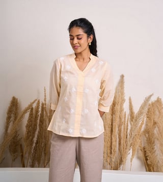 Embrace timeless elegance with this exquisite beige Chikankari top, designed for the modern woman. Crafted from breathable cotton, it features a regular fit that flatters every silhouette. The intricate Chikankari embroidery adds a touch of artisanal charm, while the three-fourth sleeves offer a perfect balance of style and comfort. The mandarin neck exudes sophistication, and the closure ensures a seamless fit. This top is a versatile addition to any wardrobe, ideal for both casual outings and elegant gatherings.