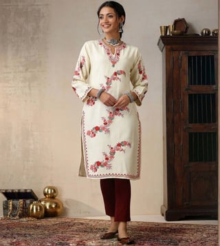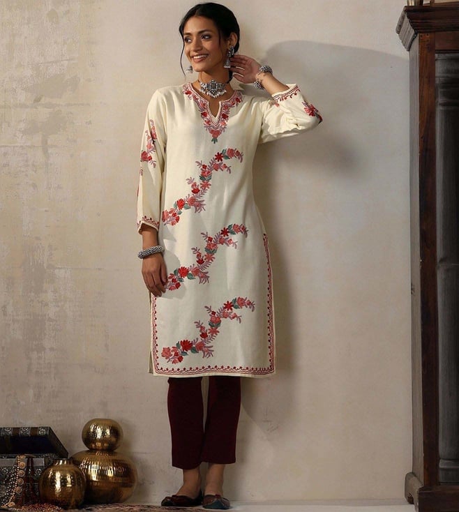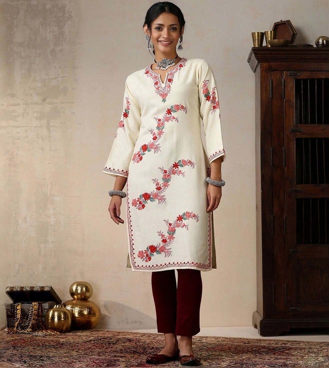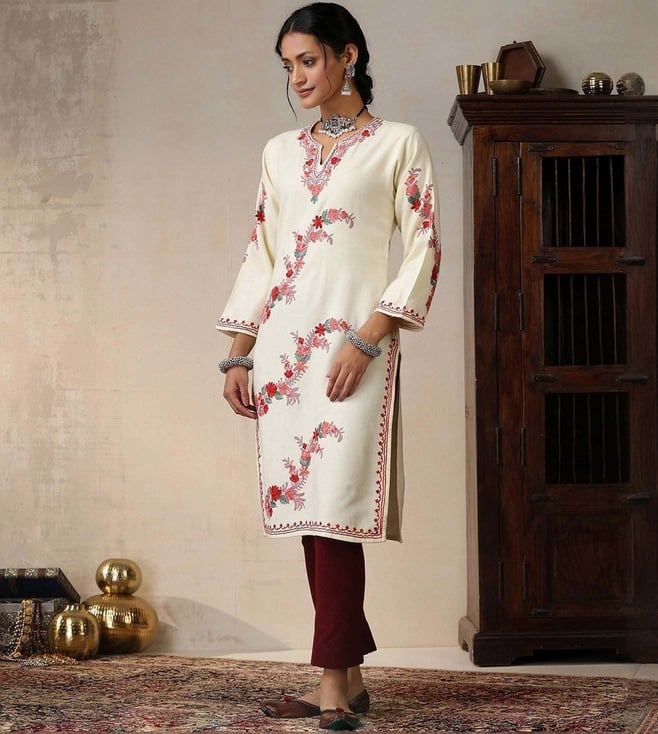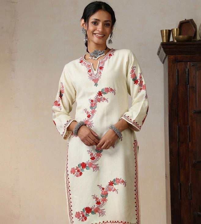 House of Chikankari Beige HOC Crafts Aari Embroidered Woollen Solid Women's Long Kurta