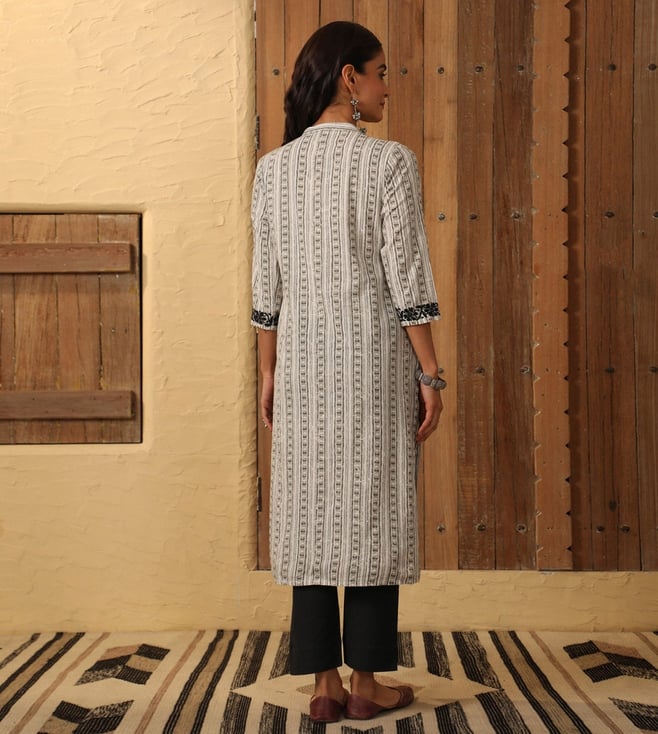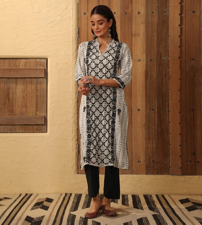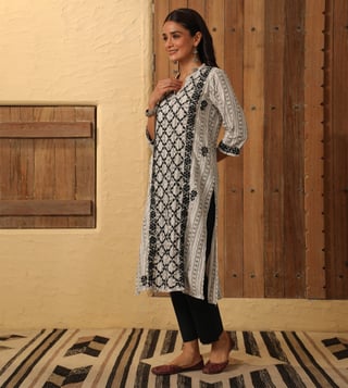 Embrace timeless elegance with this black chikankari kurta. Crafted from soft cotton, its intricate embroidery dances across the fabric, creating a delicate and captivating design. The regular fit ensures a flattering silhouette, while the 3/4th sleeves and mandarin collar add a touch of sophistication. Perfect for both casual and semi-formal occasions, this kurta is a versatile wardrobe essential that exudes effortless style.