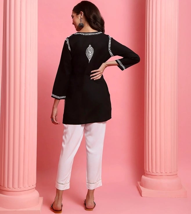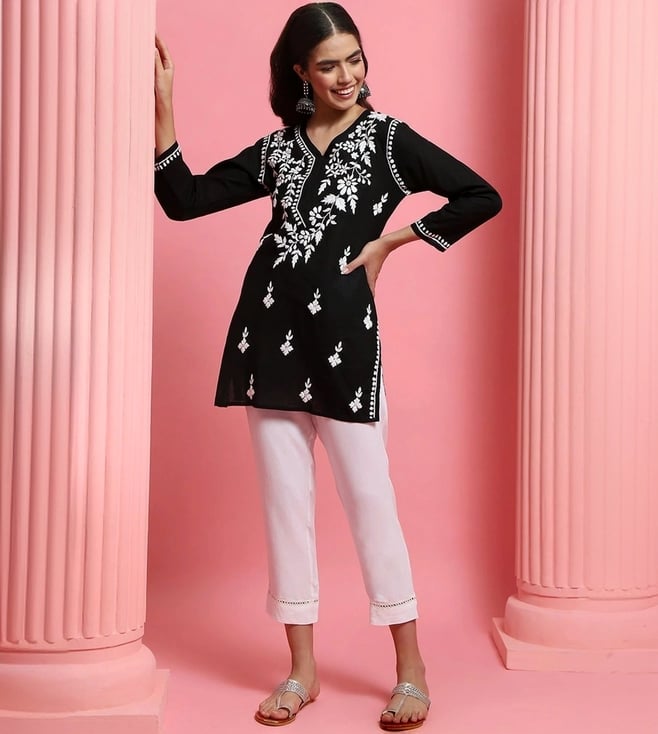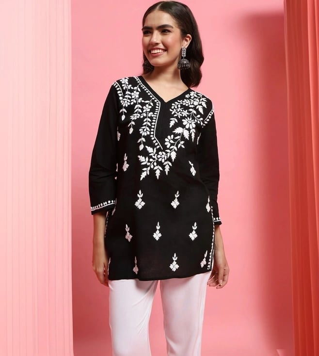 Give your wardrobe a fashionable spin with this black regular fit kurti from House of Chikankari. Tailored to sartorial perfection from premium quality fabric, it assures a soft and soothing touch against the skin. The V-neckline adds to its appeal. The three-quarter sleeves further speak for itself. The embroidery work speaks for its ornate artistry.
