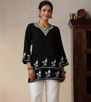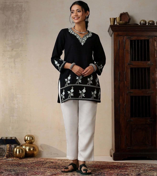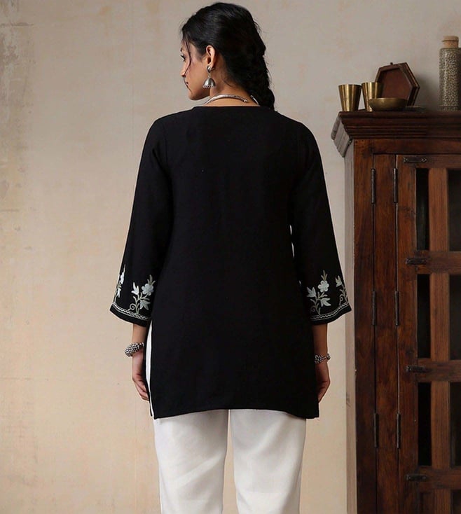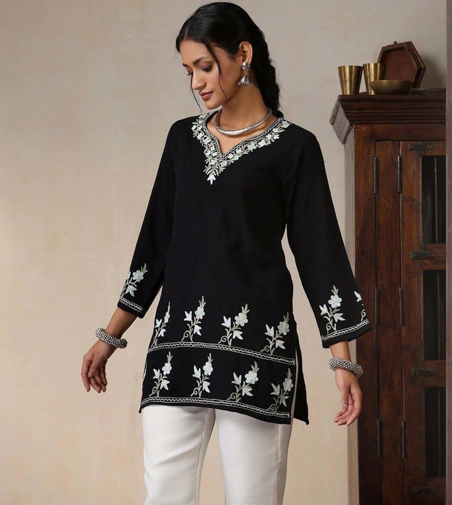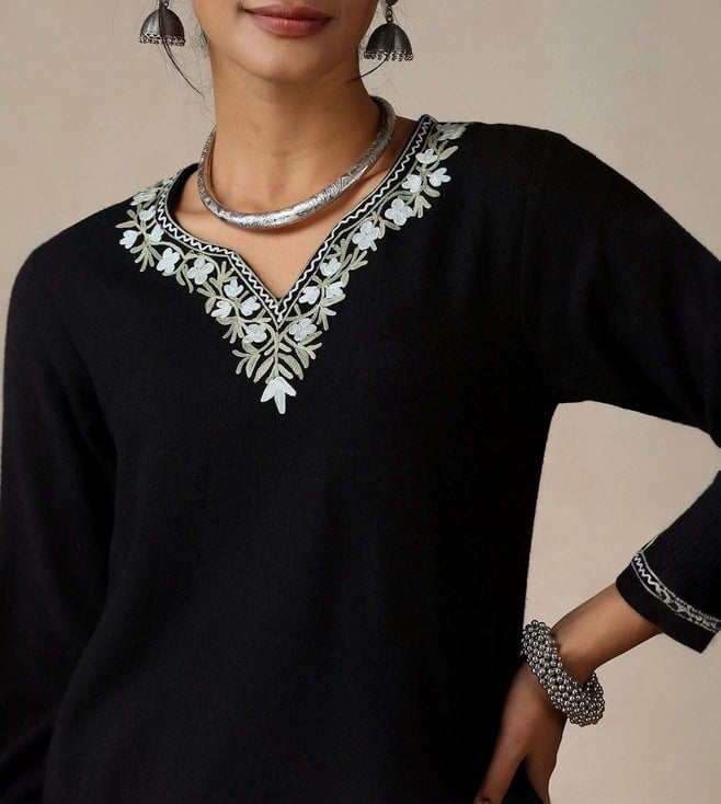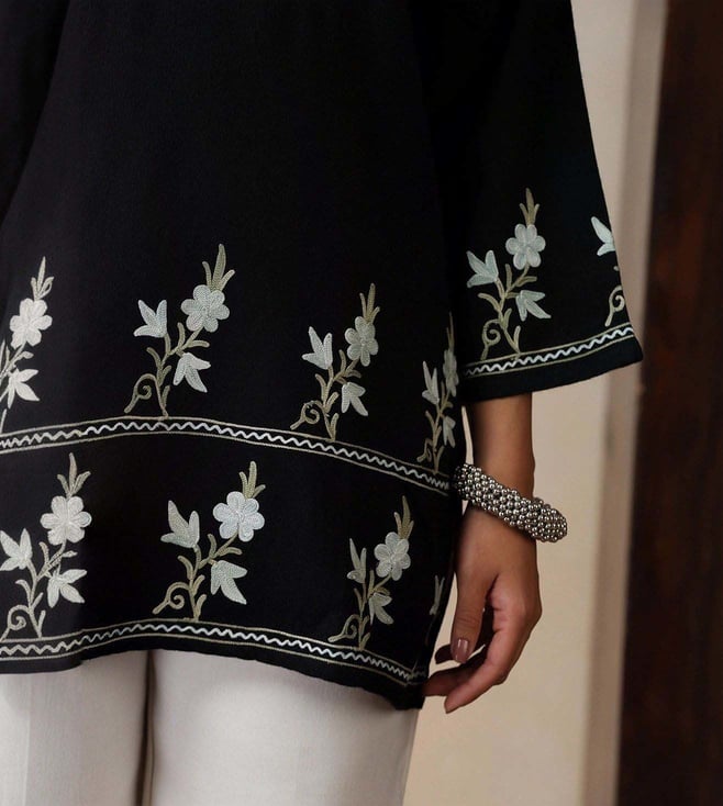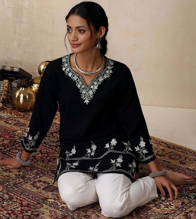 House of Chikankari Black HOC Crafts Aari Embroidered Woollen Solid Women's Short Kurta