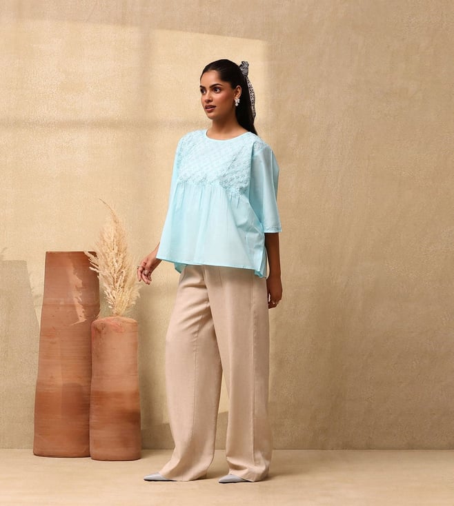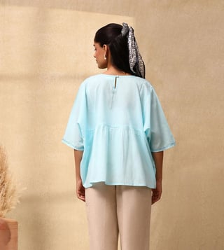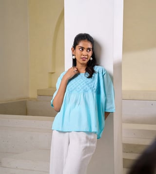 Embrace timeless elegance with this exquisite blue Chikankari top, designed for the modern woman who values comfort and style. Crafted from soft, breathable cotton, it features a relaxed fit that drapes gracefully, ensuring ease of movement. The intricate Chikankari embroidery adds a touch of traditional artistry, while the three-fourth sleeves and round neck offer a classic silhouette. A subtle closure enhances its seamless design, making it a versatile addition to any wardrobe, perfect for any occasion.
