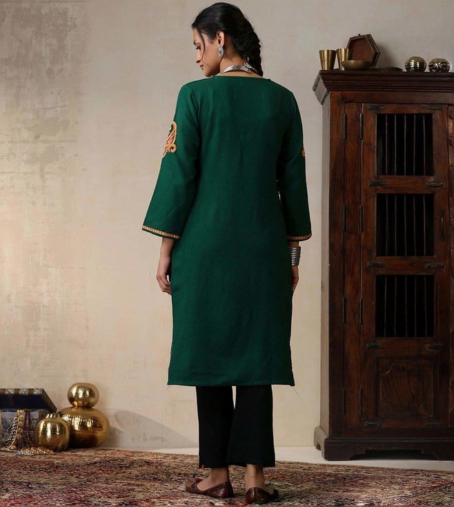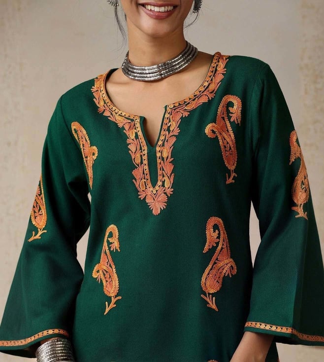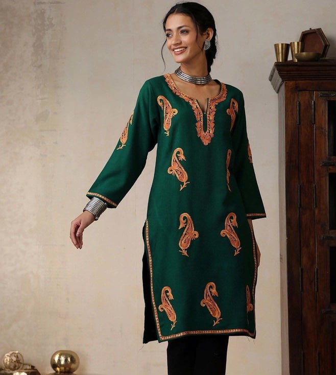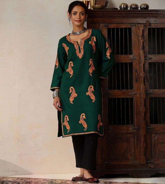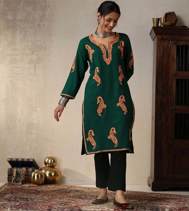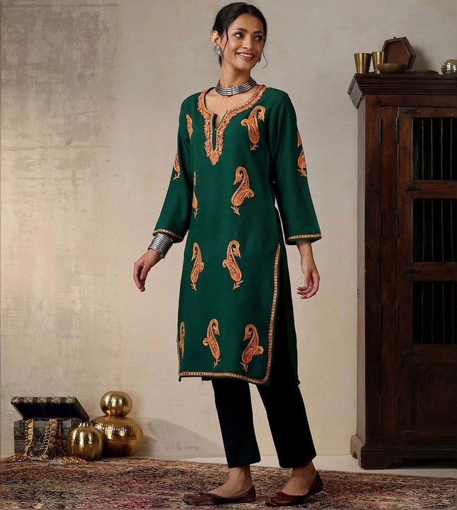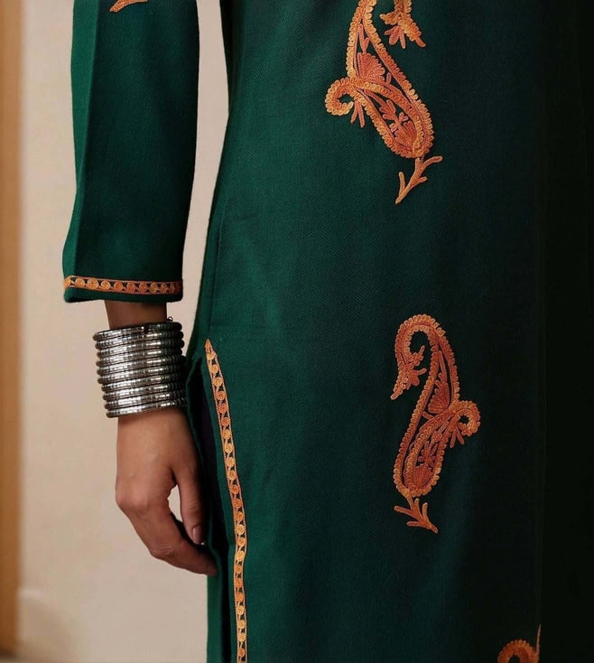 House of Chikankari Green HOC Crafts Aari Embroidered Woollen Solid Women's Long Kurta