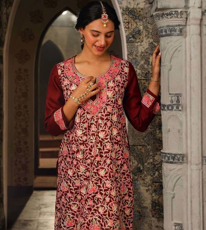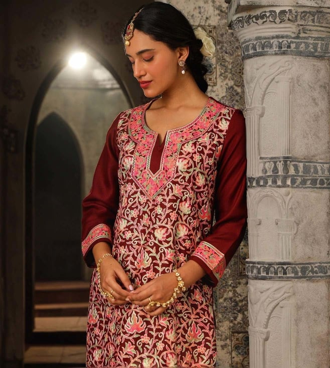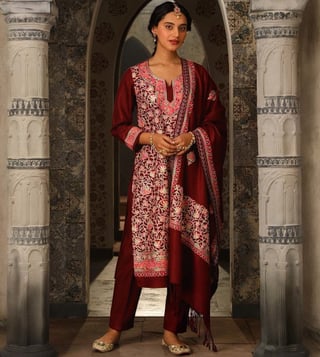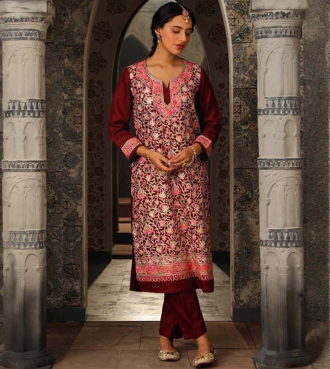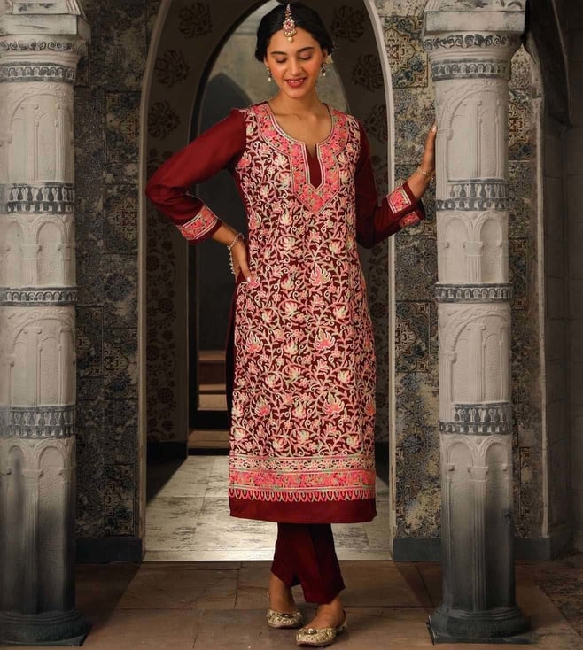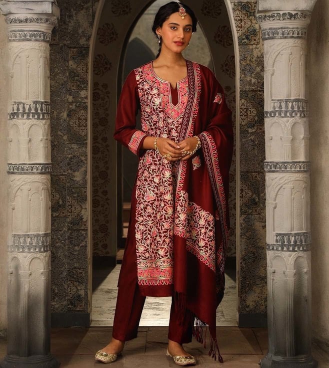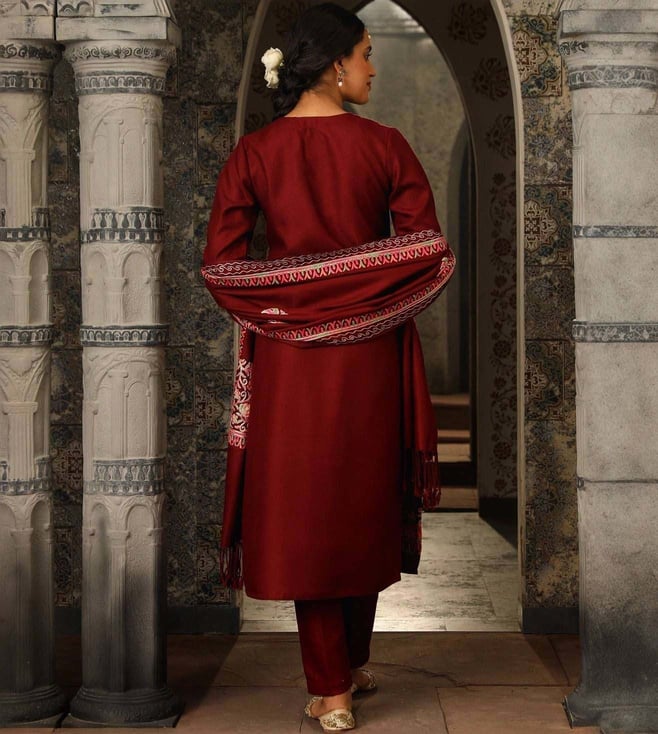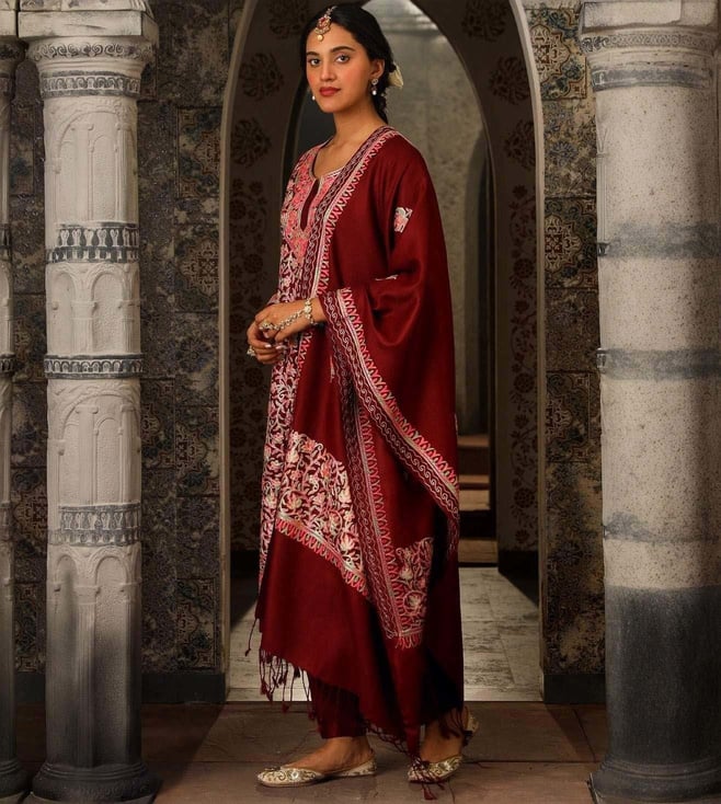 House of Chikankari Maroon HOC Crafts Aari Woollen Straight Kurta Set with Dupatta
