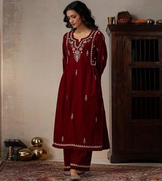 Make an instant impression on the onlookers as you step out wearing this kurta set. Tailored to sartorial perfection from velvet, it assures a soft and soothing touch against the skin. Disclaimer: Product colour may slightly vary due to photographic lighting sources. Country of Origin - India.