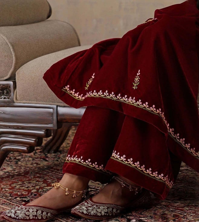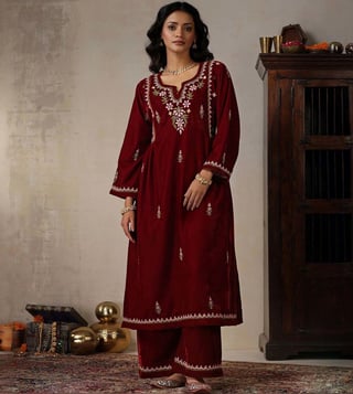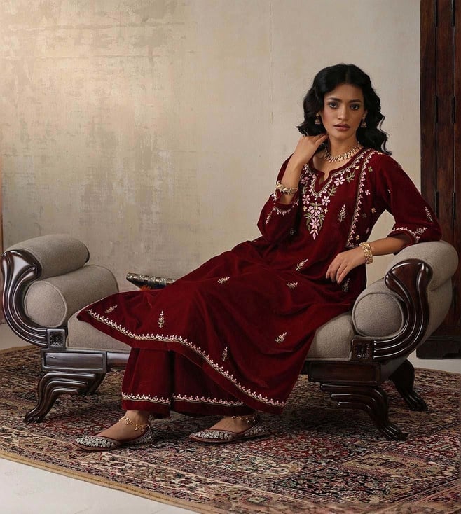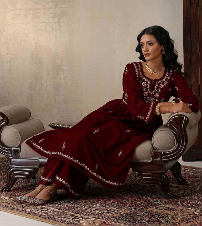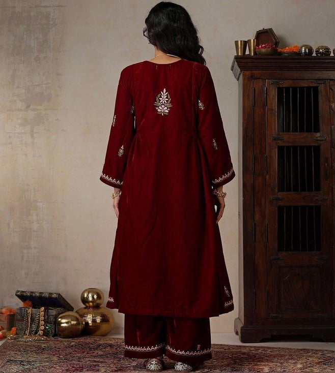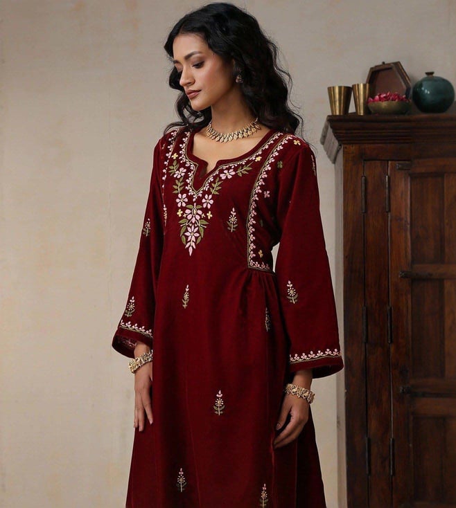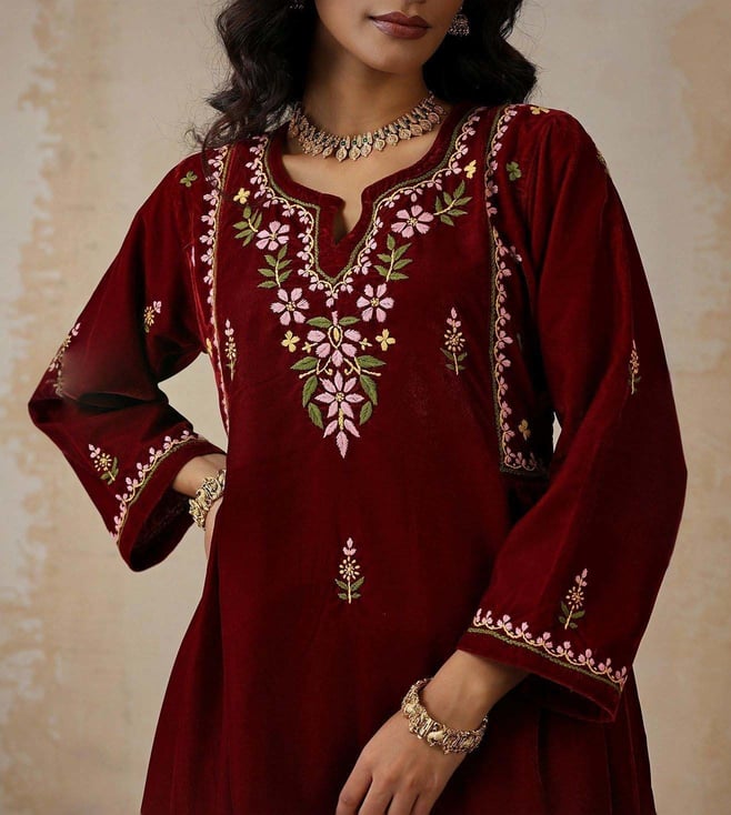 House of Chikankari Maroon Velvet Chikankari Solid Women's 2 PC Long Kurta Set