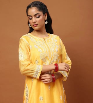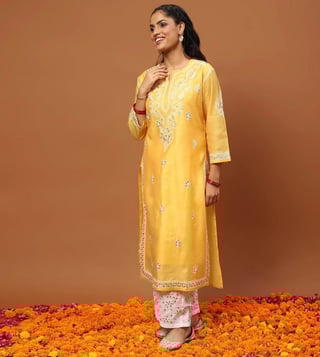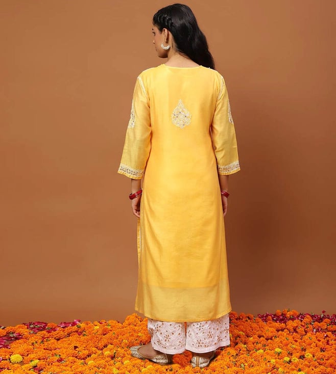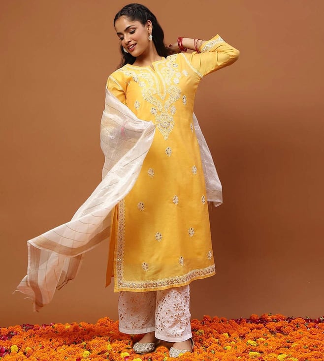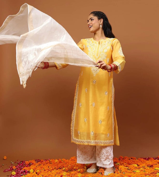 Experience House Of Chikankari Mustard Chanderi Regular Fit Kurta Set comfort and style with the perfect for any occasion, Designed for women, this dress combines tradition and elegance. Disclaimer: All other items in the image are only for display purposes and will not be a part of the delivery content. Product colour may slightly vary due to photographic lighting sources. Country of Origin - India.