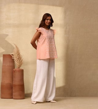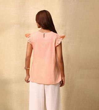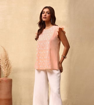 Embrace elegance with this peach-hued top, a masterpiece of Chikankari artistry. Crafted from breathable cotton, it offers a relaxed fit that drapes effortlessly, ensuring comfort and style. The short sleeves and round neck add a touch of casual sophistication, making it perfect for any occasion. Its subtle closure enhances the seamless design, while the intricate embroidery showcases traditional craftsmanship. Ideal for the modern woman who appreciates timeless beauty and understated charm.