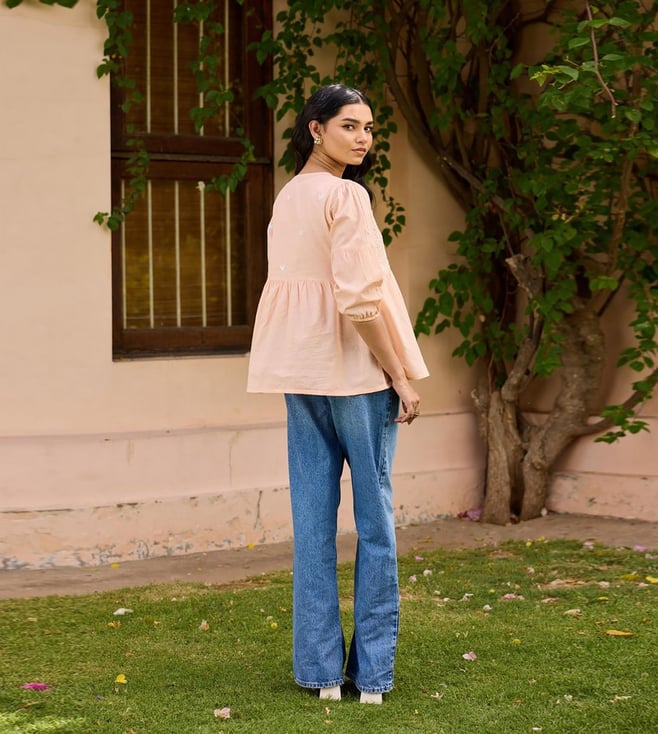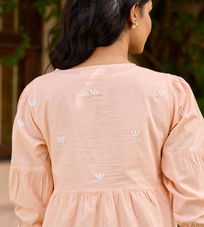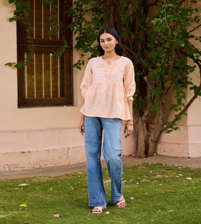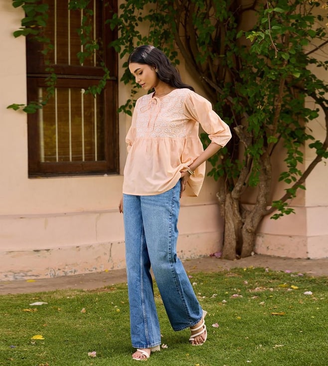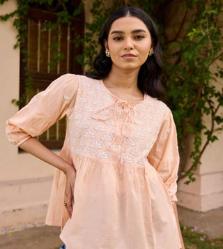 Embrace elegance with this exquisite peach top, crafted in breathable cotton for ultimate comfort. The straight fit design flatters every silhouette, while the intricate Chikankari pattern adds a touch of traditional artistry. Featuring three-fourth sleeves and a classic round neck, this top is perfect for any occasion. The subtle closure ensures a seamless finish, making it a versatile addition to your wardrobe. Ideal for the modern woman who appreciates timeless style with a cultural twist.