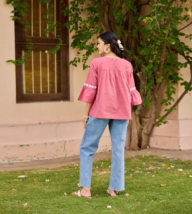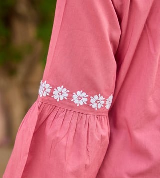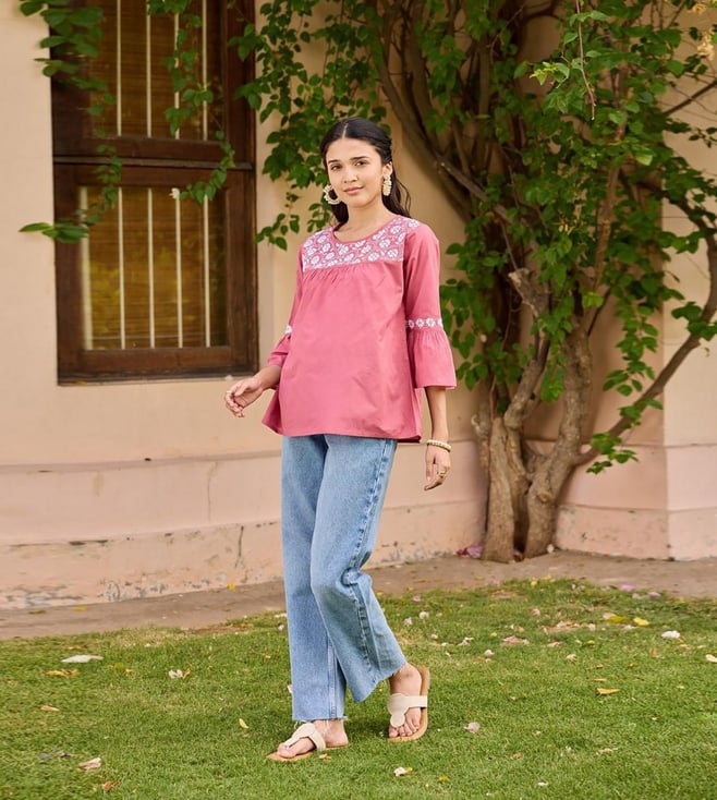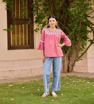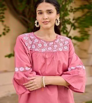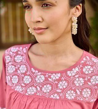 Embrace elegance with this exquisite pink Chikankari top, designed for the modern woman. Crafted from breathable cotton, it features a straight fit that flatters every silhouette. The intricate Chikankari embroidery adds a touch of traditional charm, while the three-fourth sleeves offer a perfect blend of style and comfort. A classic round neck enhances its timeless appeal, and the convenient closure ensures a seamless fit. This top is a versatile addition to any wardrobe, ideal for both casual and formal occasions.