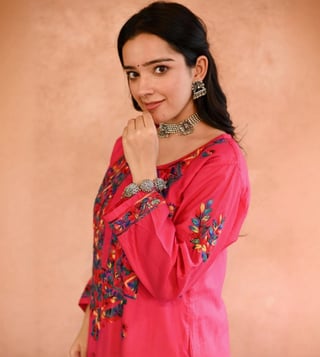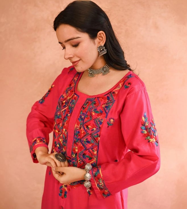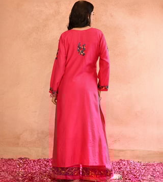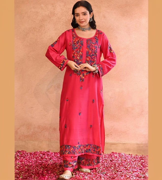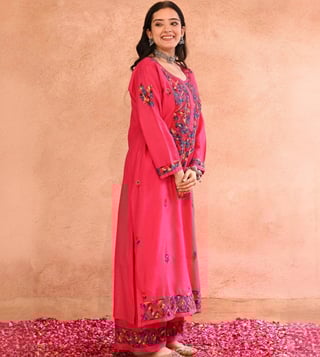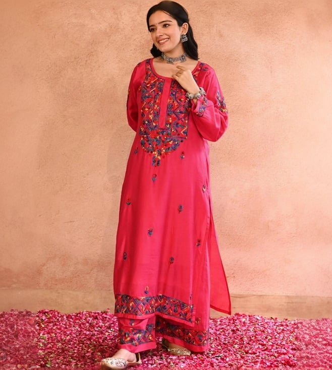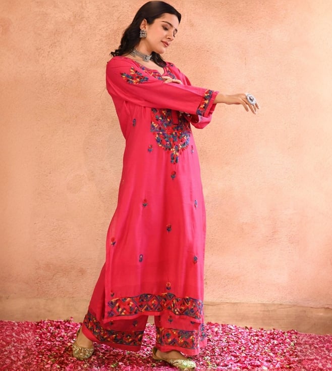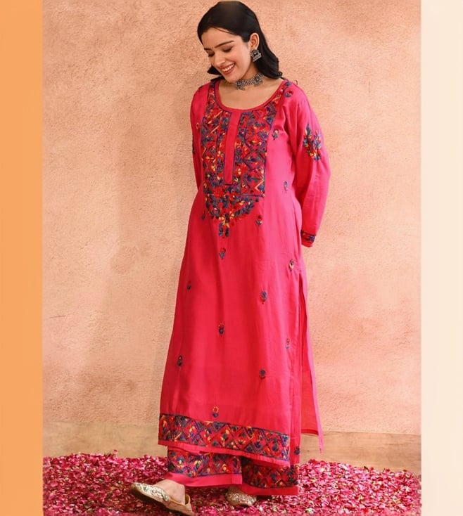 Amplify your wardrobe with this pink kurta and palazzo set from House of Chikankari. Tailored to sartorial perfection from premium quality fabric, it assures a soft and soothing touch against the skin. The round neck adds to its appeal. Exuding full sleeves, it is sure to fetch you compliments from all.