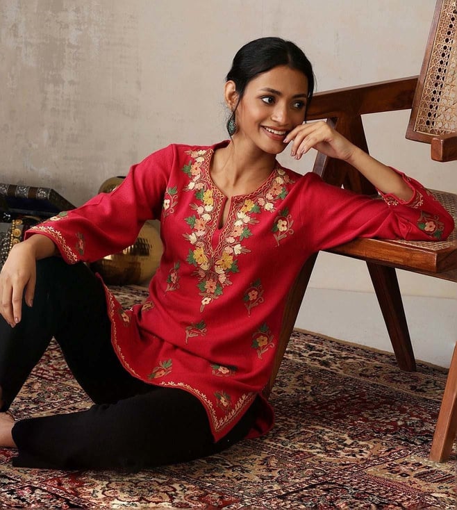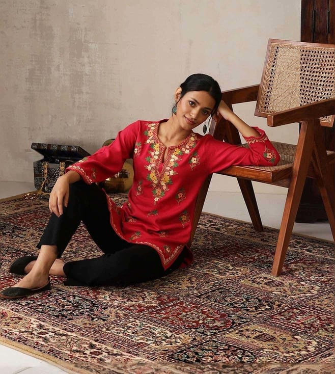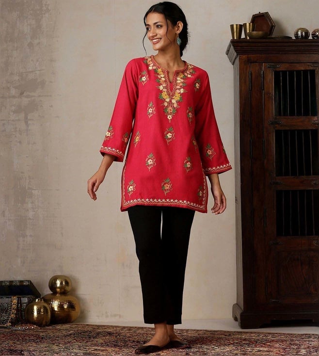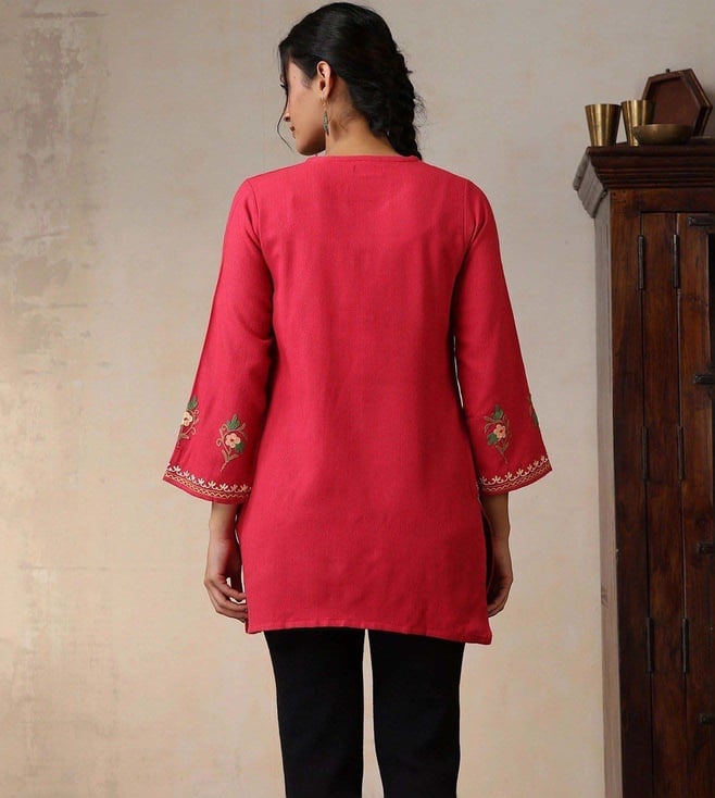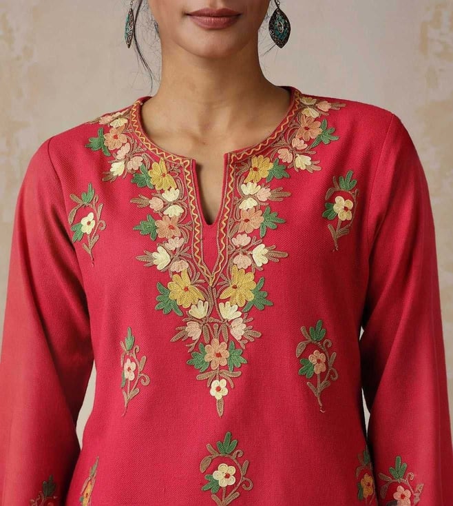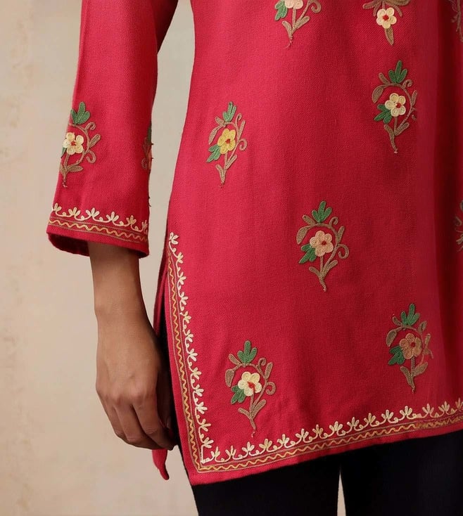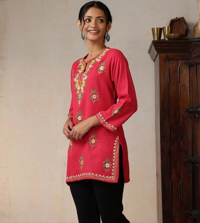 House of Chikankari Pink HOC Crafts Aari Embroidered Woollen Solid Women's Short Kurta