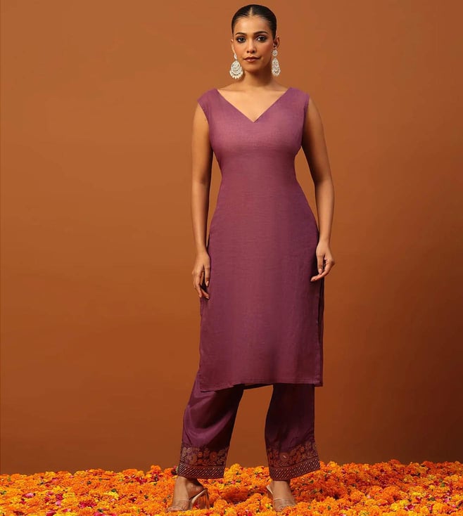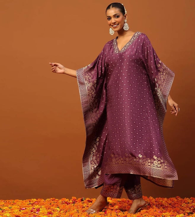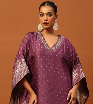 Explore the vibrant House Of Chikankari Purple Silk Blend Regular Fit Kaftan Set Perfect for any occasion, this stylish and comfortable dress showcases a colorful blend in soft cotton. Disclaimer: All other items in the image are only for display purposes and will not be a part of the delivery content. Product colour may slightly vary due to photographic lighting sources. Country of Origin - India.