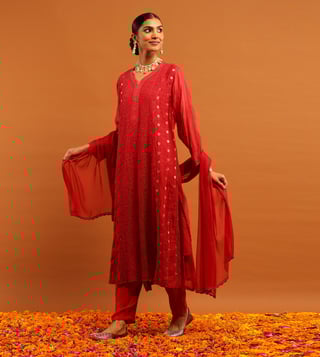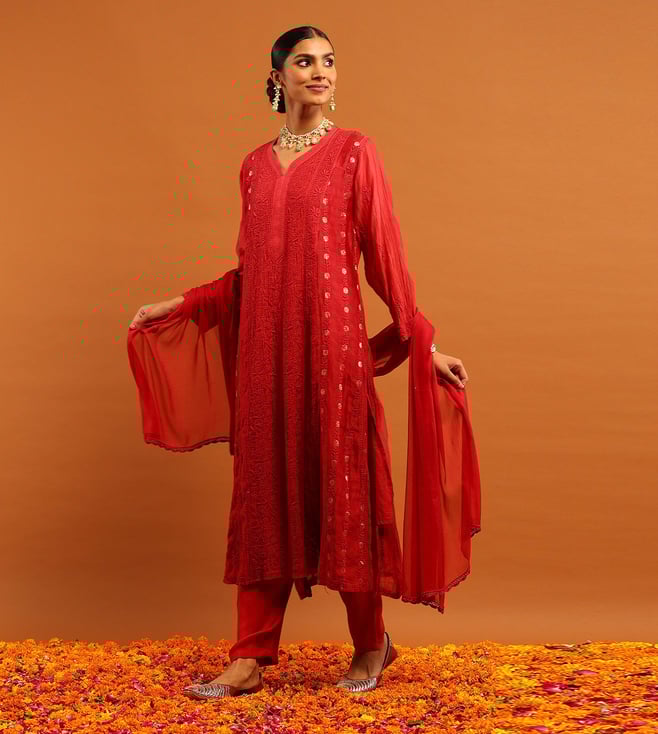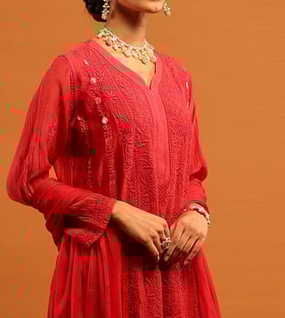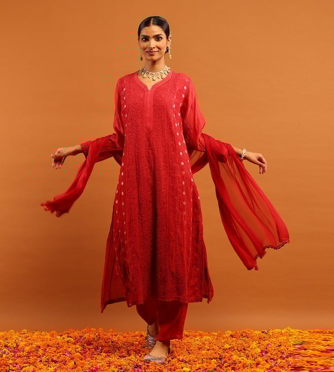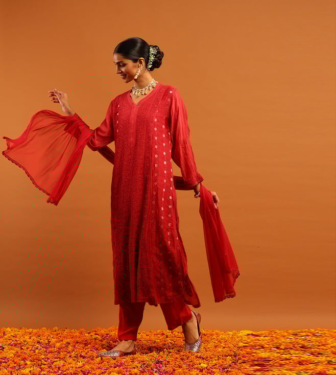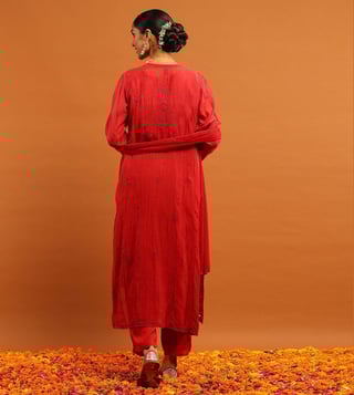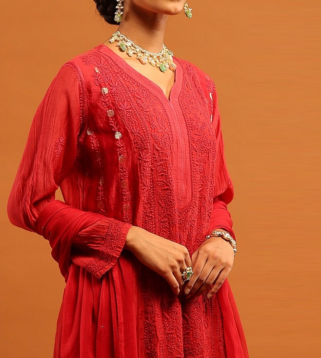 House of Chikankari Red Chanderi Regular Fit Kurta Set