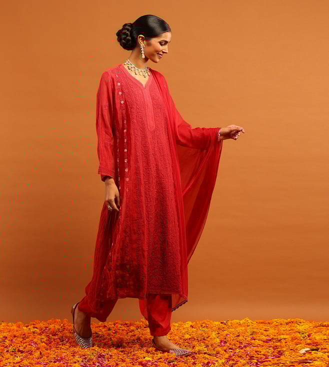 Banarasi Mul Chanderi Chikankari Solid Women's 4 PC Straight Kurta Set Red.Disclaimer: All Other Items In The Image Are Only For Display Purposes And Will Not Be A Part Of The Delivery Content. Product Colour May Slightly Vary Due To Photographic Lighting Sources. Country Of¿Origin¿¿India