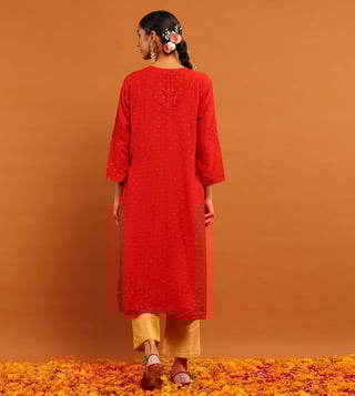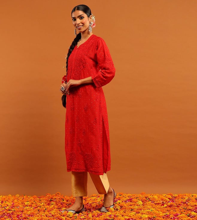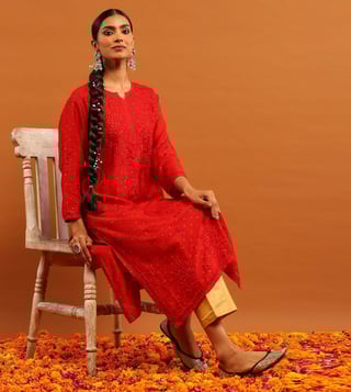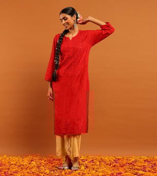House of Chikankari Red Chanderi Regular Fit Kurta