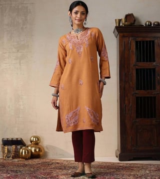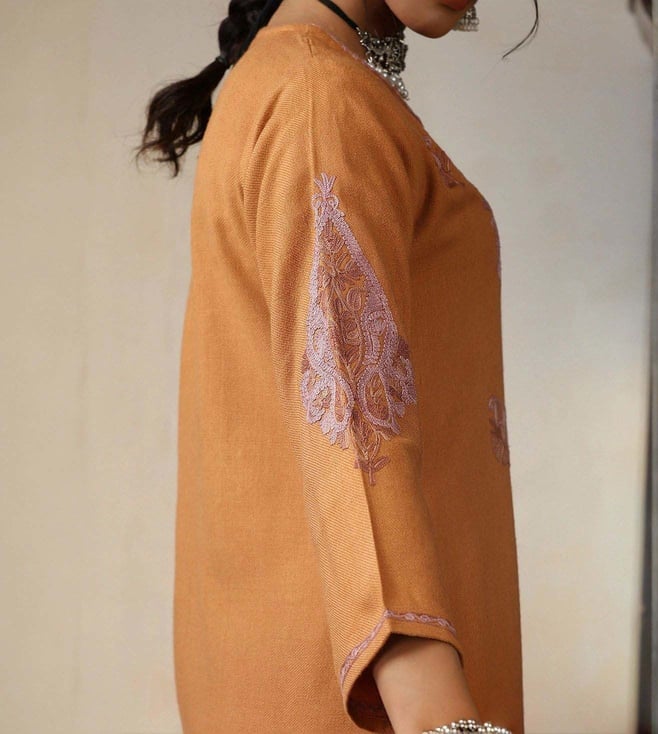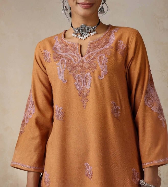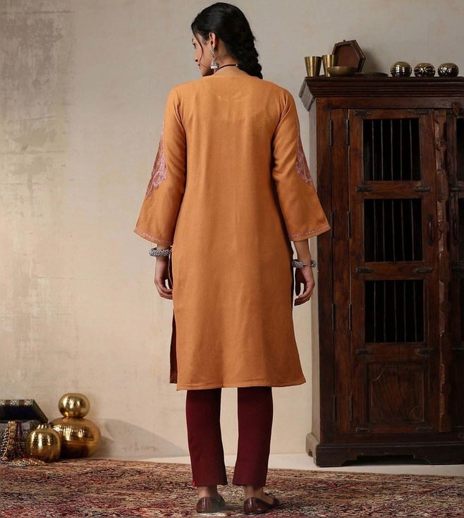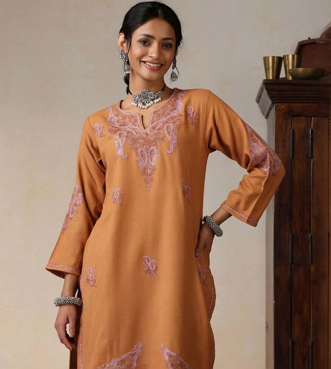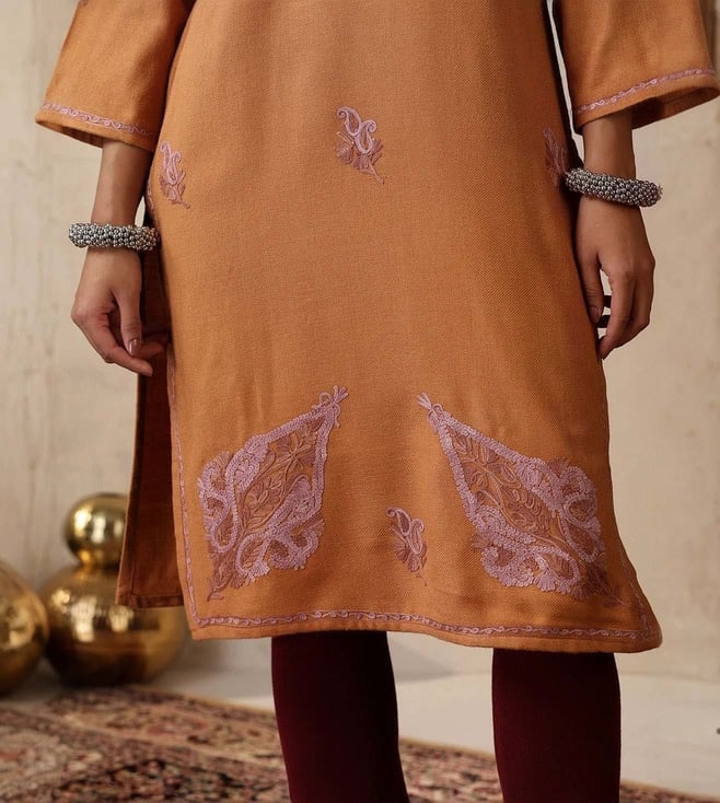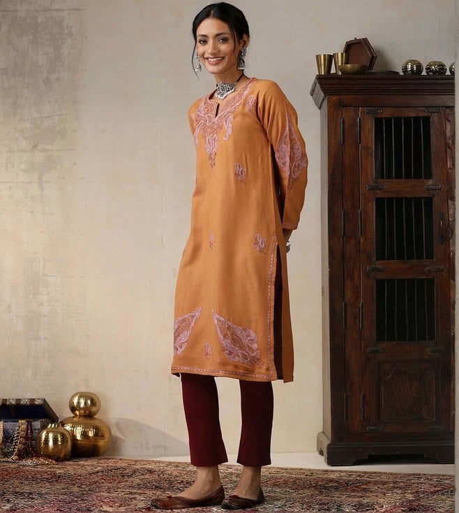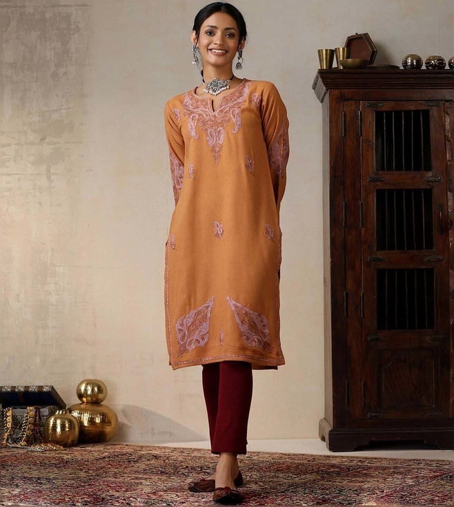 House of Chikankari Rust HOC Crafts Aari Embroidered Woollen Solid Women's Long Kurta