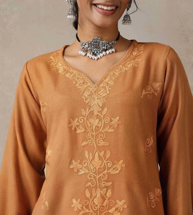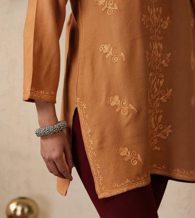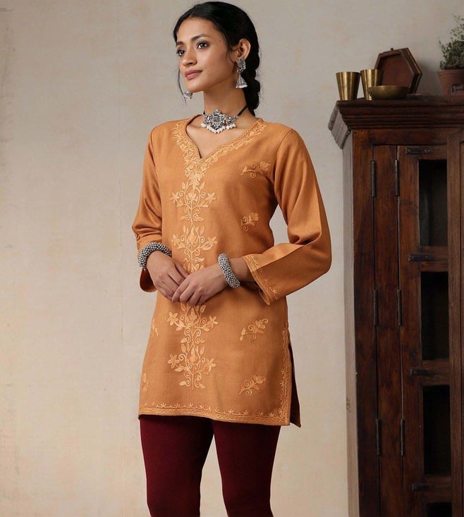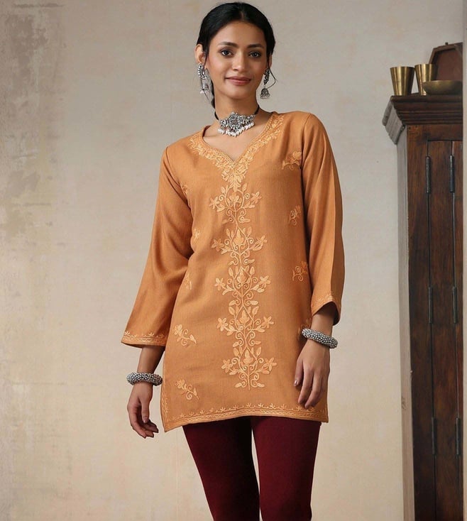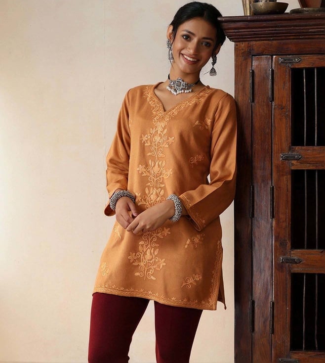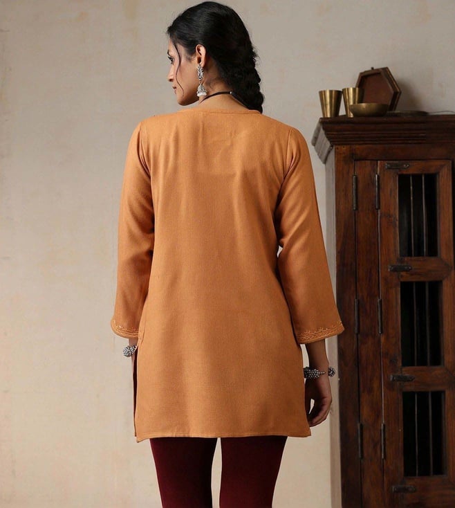 House of Chikankari Rust HOC Crafts Aari Embroidered Woollen Solid Women's Short Kurta