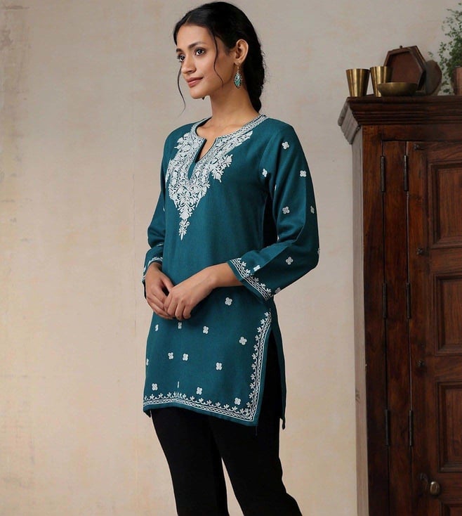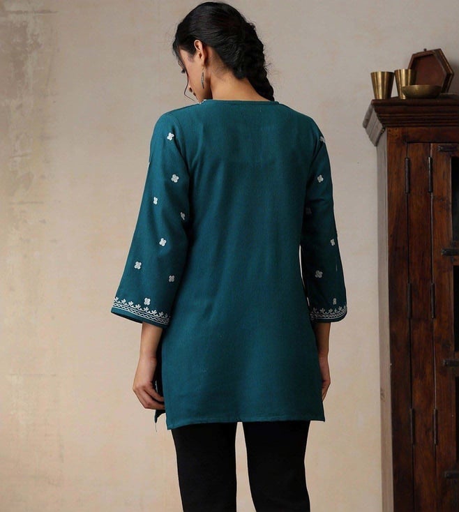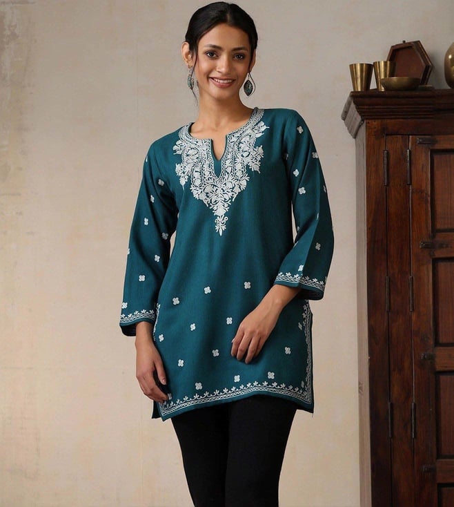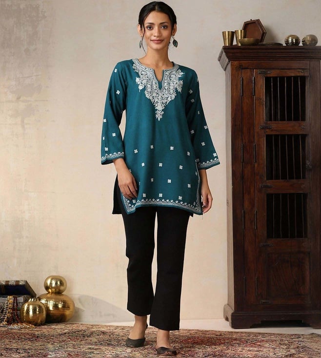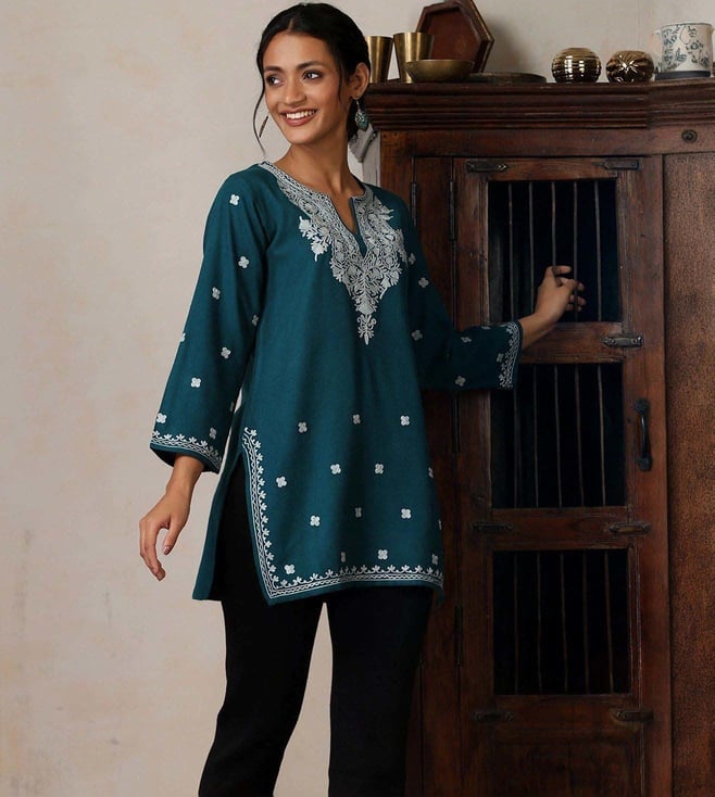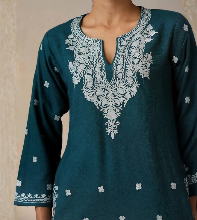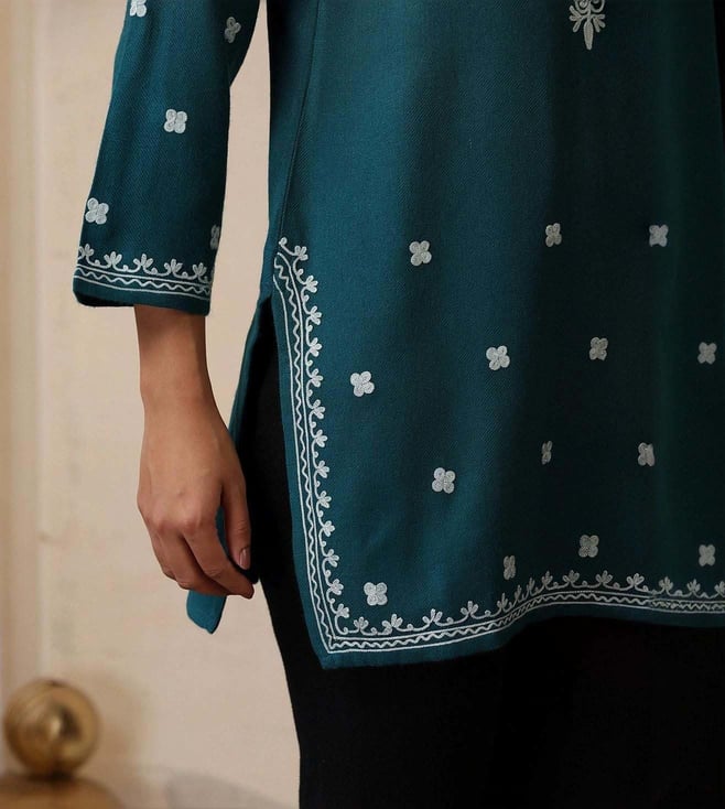 Teal HOC Crafts Aari Embroidered Woollen Solid Women's Short Kurta