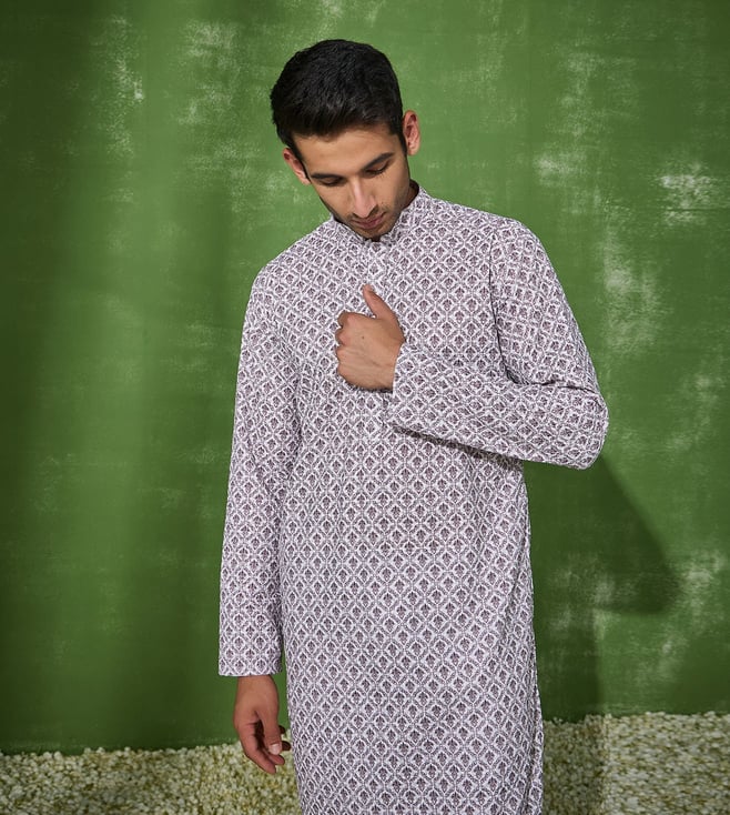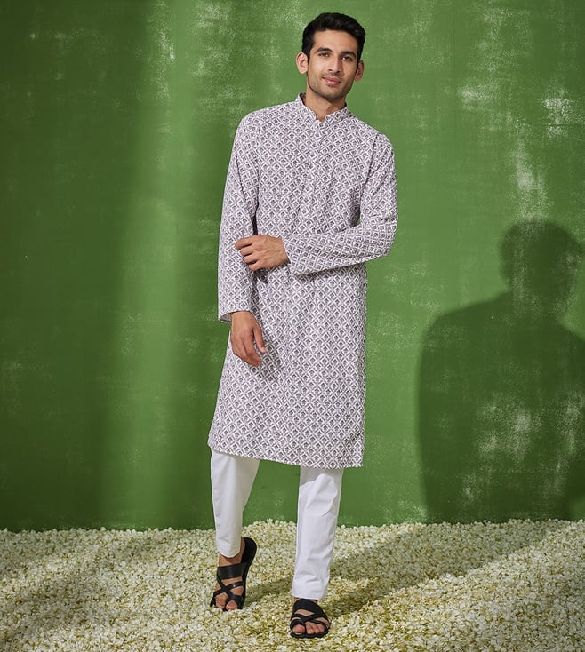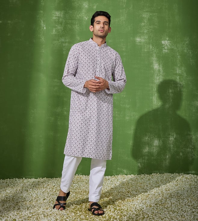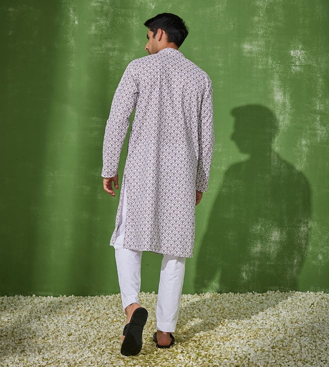 Introduce some traditional charm with this stylish House of Chikankari White & Brown Cotton Kurta for men. Made from soft and breathable cotton, this festive wear features intricate chikankari work, full sleeves, and a classic straight cut design. Perfect for special occasions and ceremonies. Get yours now!' Disclaimer: All other items in the image are only for display purposes and will not be a part of the delivery content. Product colour may slightly vary due to photographic lighting sources. Country of Origin - India.