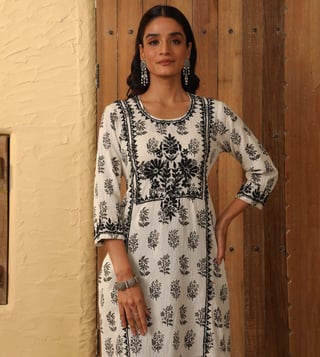 Embrace the timeless elegance of our white cotton kurta, meticulously crafted with intricate chikankari embroidery. The delicate floral motifs dance across the fabric, creating a symphony of grace. The 3/4th sleeves and round neck offer a classic silhouette, while the regular fit ensures a comfortable and flattering drape. This kurta is a versatile piece that effortlessly transitions from day to night, making it perfect for any occasion.