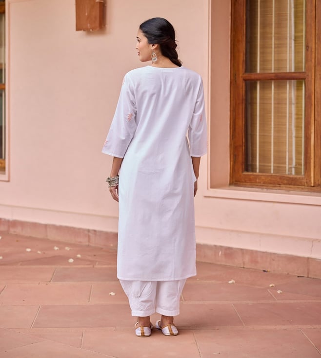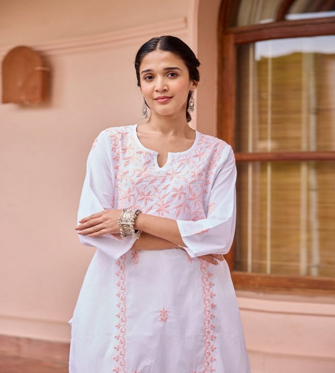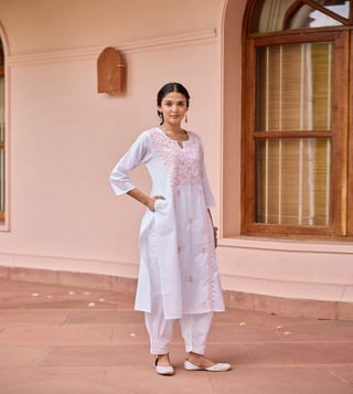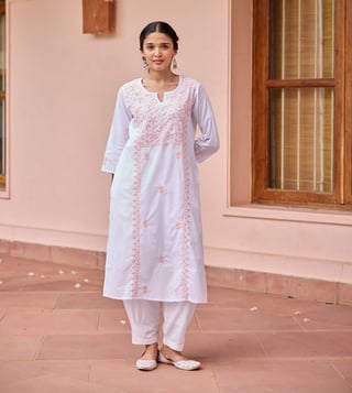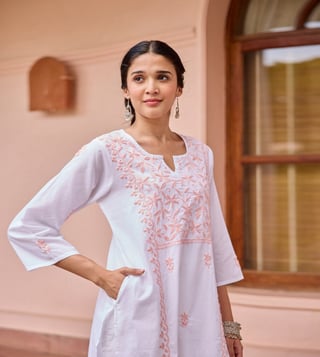 Embrace timeless elegance with this exquisite white Kurti, crafted in breathable cotton for ultimate comfort. The straight fit silhouette gracefully drapes, showcasing the intricate Chikankari embroidery that whispers tales of tradition. Its three-fourth sleeves add a touch of modernity, while the round neck offers a classic appeal. Designed for the discerning woman, this Kurti features a subtle closure, ensuring a seamless blend of style and functionality. Perfect for any occasion, it embodies sophistication and grace.