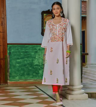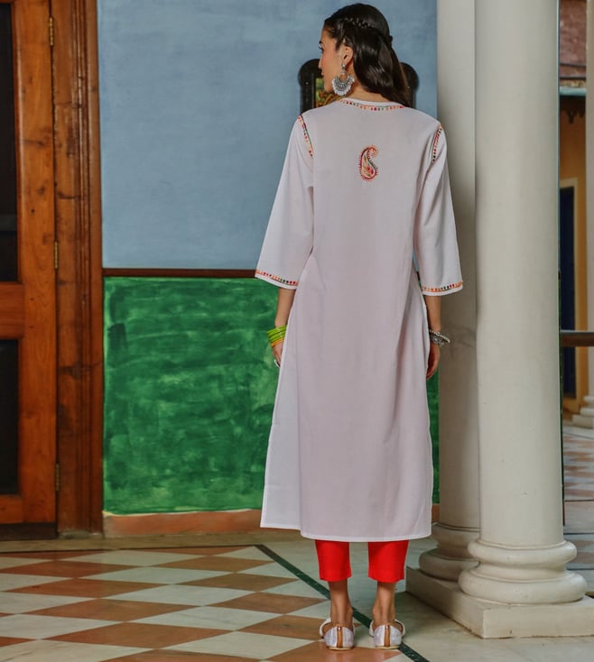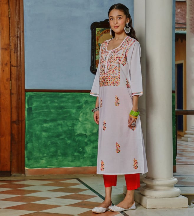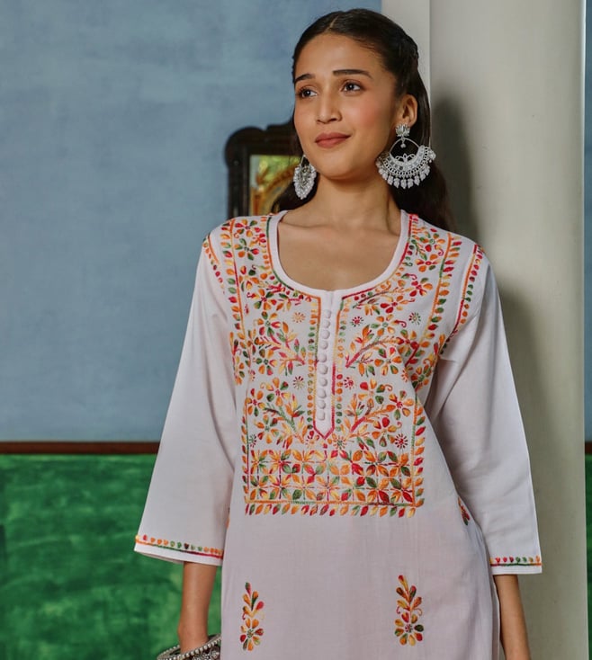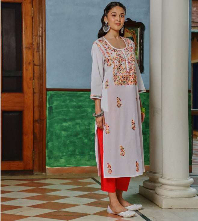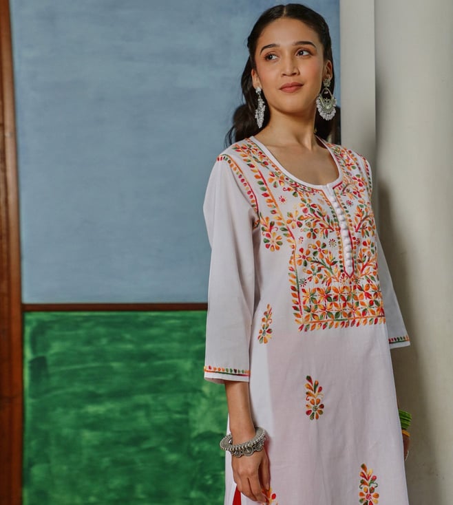 House of Chikankari White Cotton Straight Fit Chikankari Long Kurta