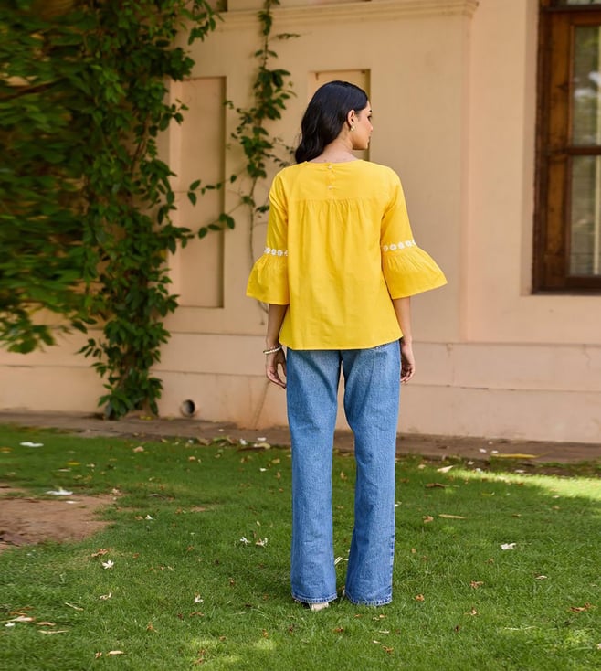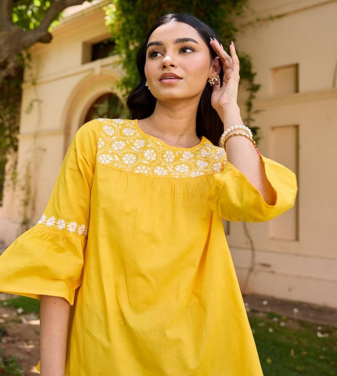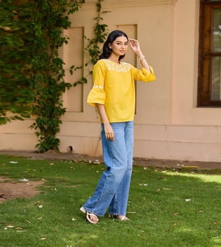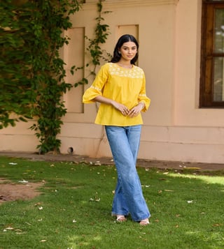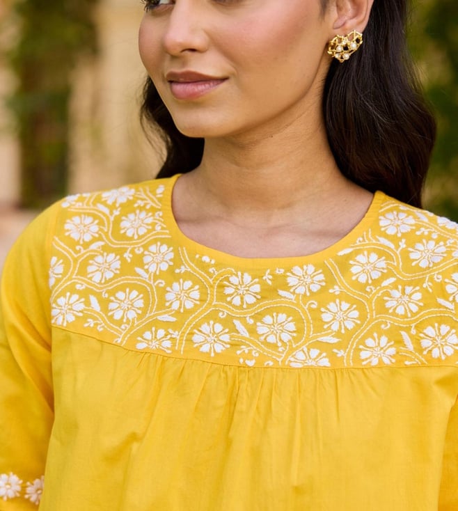 Embrace elegance with this exquisite yellow Chikankari top, designed for the modern woman who appreciates timeless craftsmanship. The straight fit gracefully complements your silhouette, while the intricate Chikankari embroidery adds a touch of traditional artistry. Crafted from breathable cotton, it ensures comfort throughout the day. The three-fourth sleeves and round neck offer a classic appeal, and the convenient closure enhances its practicality. Perfect for any occasion, this top is a harmonious blend of style and tradition.