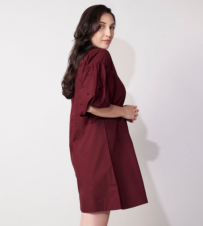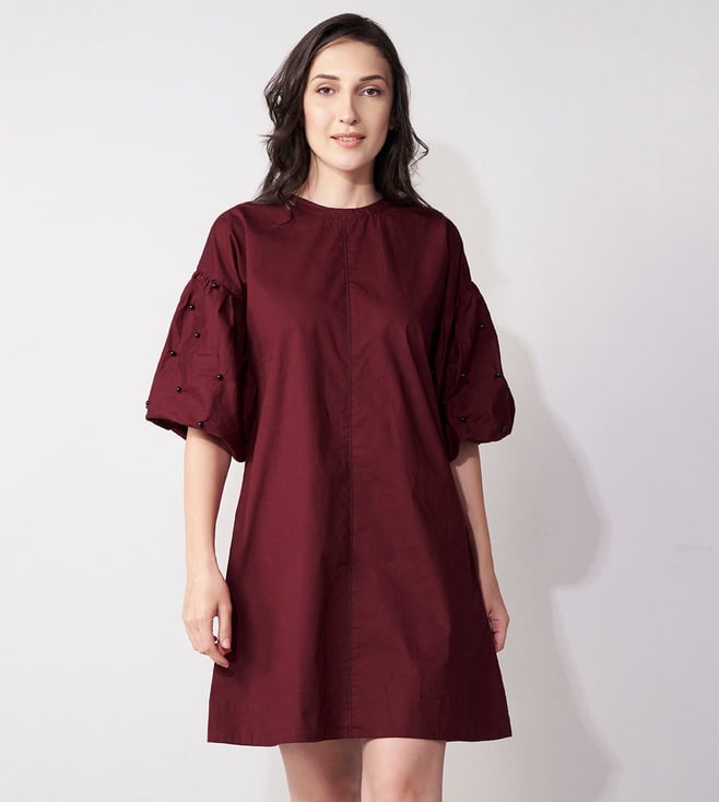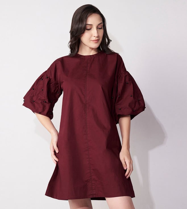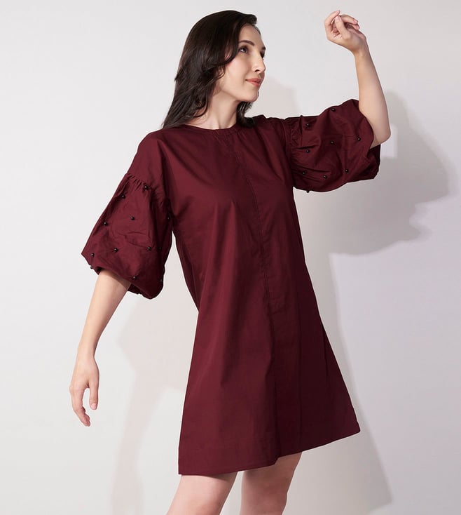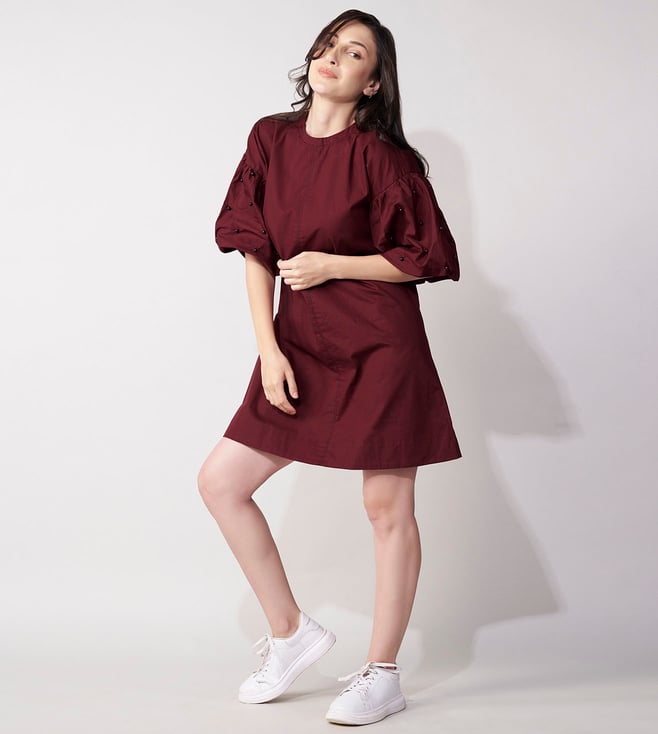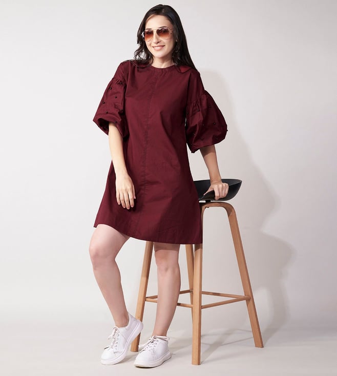 Add a touch of elegance to your wardrobe with our House of Manaa maroon mini dress. Beautifully embroidered with intricate beadwork, this dress features flattering balloon sleeves and is made from 100% cotton. Perfect for any casual occasion.' Disclaimer: All other items in the image are only for display purposes and will not be a part of the delivery content. Product colour may slightly vary due to photographic lighting sources. Country of Origin - India.