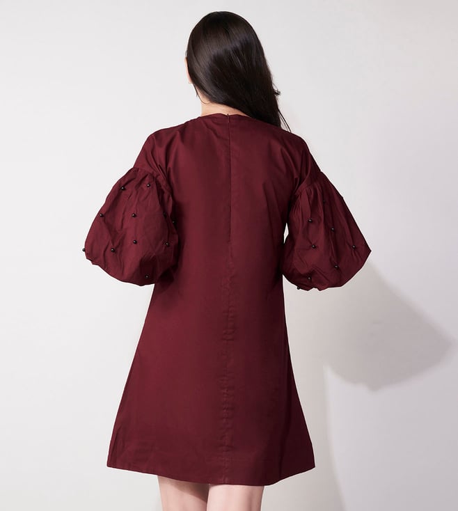 House of Manaa Maroon Beadwork Embroidered Balloon Sleeve Mini Dress