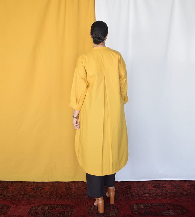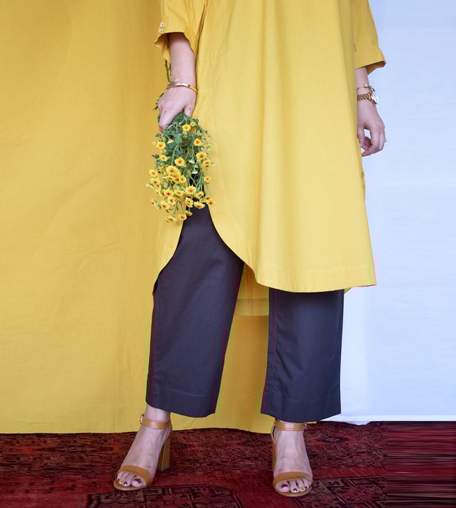An anti-fit cotton kurta with mandarin collar and front open placket. This kurta has a drop shoulder pattern with loose fitted sleeves and pockets. The back features a yoke with box pleat detail. This set comes with a pair of straight fit pants with full elastic waistband.
