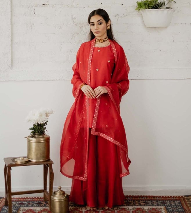 Channel a winning style effortlessly by wearing this chanderi kurta, dupatta and organza garara from the Devi collection by House of Pink. The kurta comes with zardozi handwork on sleeves, neck and front. The embroidered dupatta and garara completes the set. Disclaimer: Product colour may slightly vary due to photographic lighting sources. Country Of Origin - India.