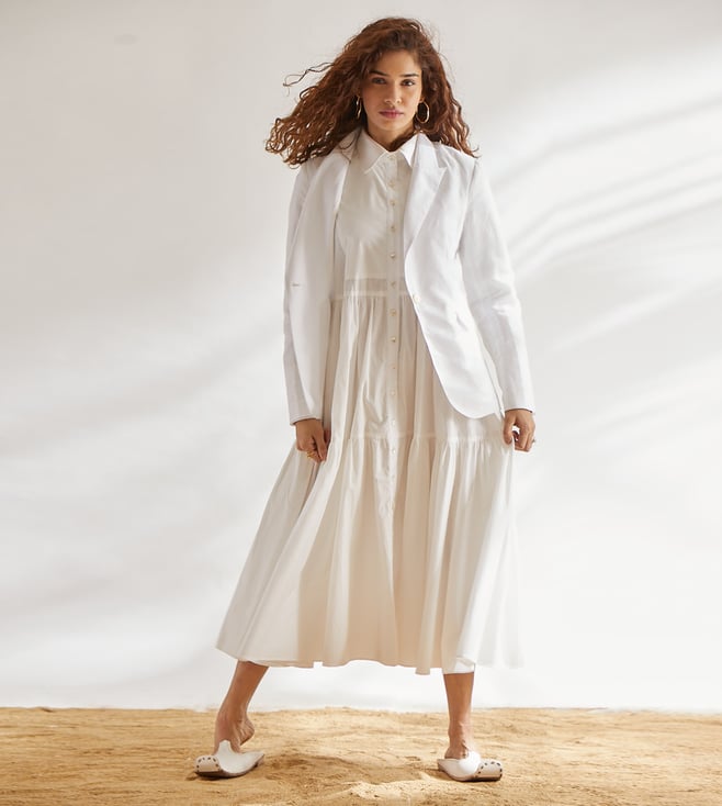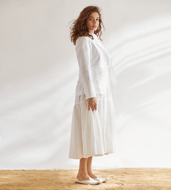 Impress your peers by wearing this white blazer from House of Three. The notched lapel collar adds to its appeal. Exuding full sleeves, it is sure to fetch you compliments from all. Crafted using premium quality cotton linen fabric, it gives you a soft and luxurious touch against your skin. Country of Origin - India. Disclaimer: All other items in the image are only for display purposes and will not be a part of the delivery content. Product colour may slightly vary due to photographic lighting sources.